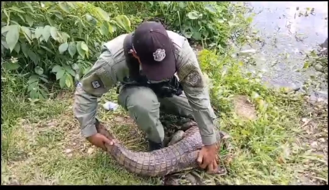 POLICÍA AMBIENTAL RESCATA CAIMÁN DENTRO DE LA PISCINA DE UNA RESIDENCIA