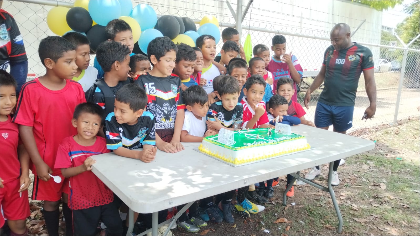 NIÑOS QUE CONFORMAN EL EQUIPO DE LA POLICÍA NACIONAL, ÁGUILAS DE ANCÓN FUERON SORPRENDIDOS CON UN PASTEL DE CUMPLEAÑOS