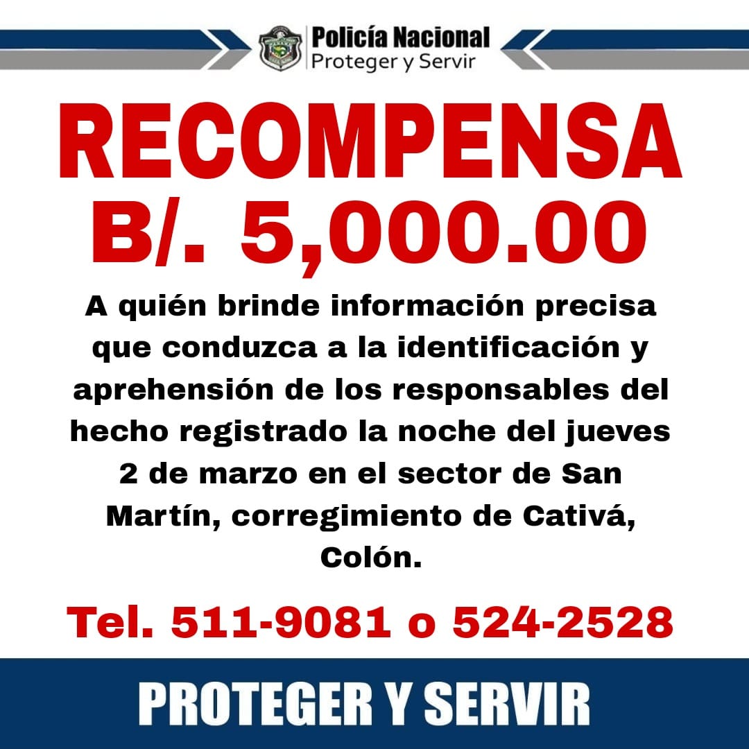 LA POLICÍA NACIONAL, OFRECE CINCO MIL BALBOAS DE RECOMPENSA PARA DAR CON LOS RESPONSABLES DE INCIDENTE EN COLÓN