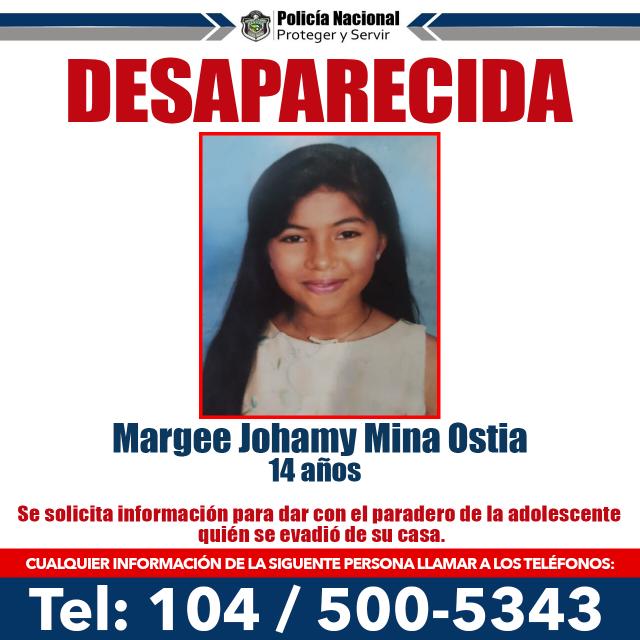 Sábado, 24 de septiembre de 2022 a las 5:30 pm Margee Yohamy Mina Ostia de 14 años de edad se encuentra desaparecida luego que su madre interpusiera la denuncia, la misma... |