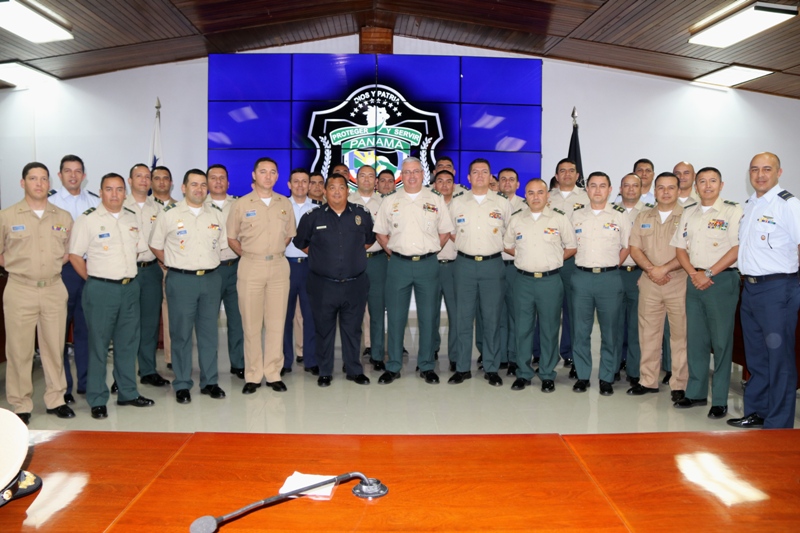 El Curso de Estado Mayor 2017 denominado “Prácticas Geoestratégicas Internacionales” de la Escuela Superior de Guerra de Colombia, visitaron la sede de la Policía Nacional de Panamá ubicada en el corregimiento de Ancón. En su visita fueron recibidos por Omar Pinzón, director de la primera institución de seguridad, quien agradeció que escogieran a nuestro país para realizar esta gira de estudio. “Como es un viaje de estudio, para nosotros es muy importante compartir algunas experiencias, como Panamá juega su rol en defensa, nosotros hemos entrenado a nuestras unidades, para que cumplan este tipo de tareas” destacó Pinzón Marín. Durante la presentación el comisionado Jorge Escobar, director Nacional de Docencia, hablo sobre las estrategias que son utilizadas en materia de seguridad, de la zona de tránsito y la evolución de Panamá. “Es importante que sepan que la Seguridad en Panamá se compone de 3 eje: Seguridad Ciudadana, Seguridad Territorial y Protección de la Gobernabilidad Democrática y Libertada Ciudadana”, señaló Escobar. Este Curso de estado Mayor tiene una duración de un año y está compuesto por 30 oficiales, 29 de Colombia y 1 de México a cargo del Brigadier General Helder Fernando Giraldo Bonilla, quienes para finalizar dicho curso realizan una gira de estudio a un país de su elección. En este acto se realizó una presentación folklórica por parte del conjunto típico de la Escuela de Oficiales Doctor Justo Arosemena, quienes bailaron dos piezas entre ellas El Punto, que fue aplaudida por cada uno de los presentes. El subirector de la Policía Nacional, Alonso Vega Pino, el Inspector, General Julio Lasso; el Secretario General Jonny Rangel, el director Nacional de Operaciones el comisionado José Ríos y el comisionado Joaquín Vergara director Nacional de Telemática, acompañaron al director en esta visita. Para finalizar se realizaron entregas de obsequios institucionales, por parte del señor Omar Pinzón hacia el General Giraldo Bonilla en agradecimiento, además el director recibió varios obsequios por parte del Curso de Estado Mayor. |