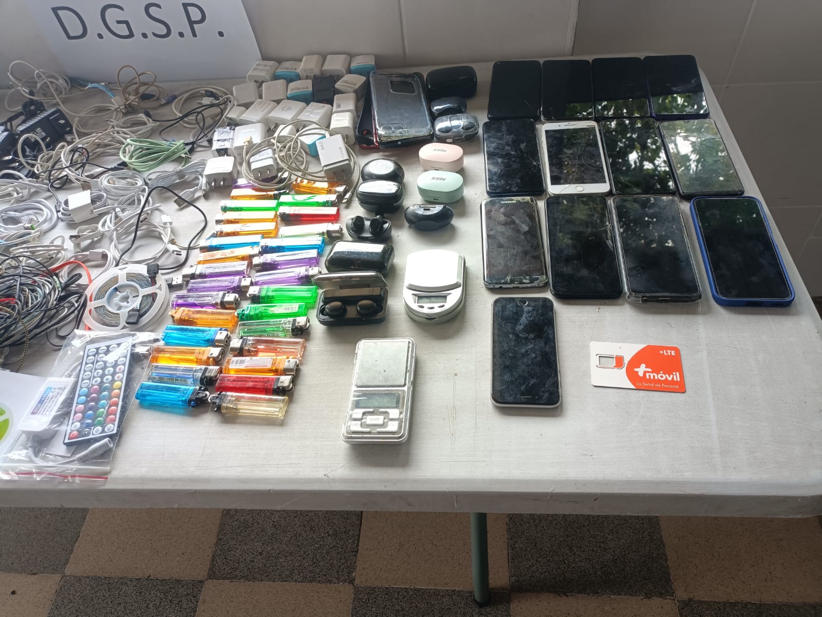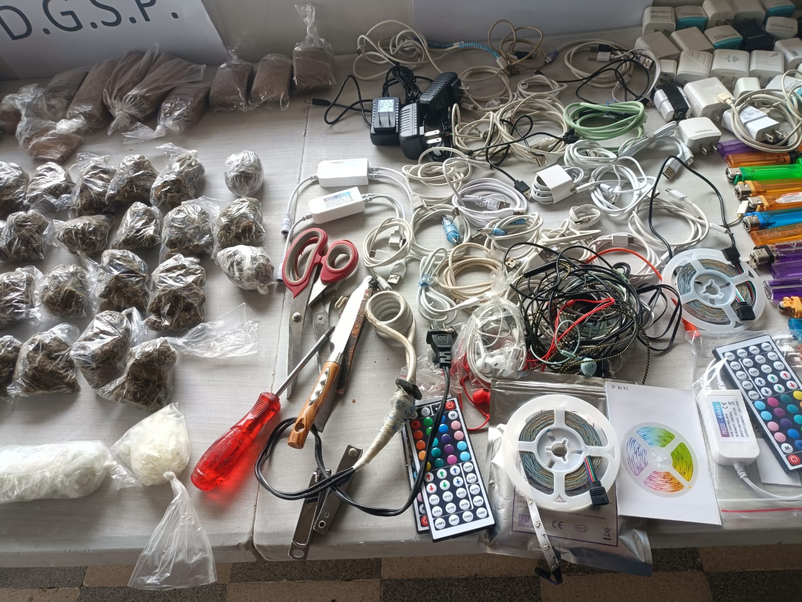Unidades de la Policía Nacional realizan una requisa en la sección número tres del Centro Penitenciario de Tinajitas, donde también participan 28 custodios del Sistema Penitenciario. En dicha requisa se ubican los siguientes artículos: unos 28 bultos de marihuana. Tres bultos de sustancia blanca que se presume sea cocaína, 10 bultos de hojas de filing, cuatro bultos de carrizos, 248 carrizos de cocaína y 200 paquetes de cigarrillos. También se decomisaron 13 celulares, 11 audífonos inalámbricos, 29 encendedores, dos pesas digitales, tres controles de luces Led, 23 cabezotes de cargadores de celulares y 35 cables de cargadores de teléfonos celular. También encontramos dos tijeras, un cuchillo, dos corta uñas, seis adaptadores tres de estos para bocinas, así como tres rollos de luces led y un anillo de color dorado. |
