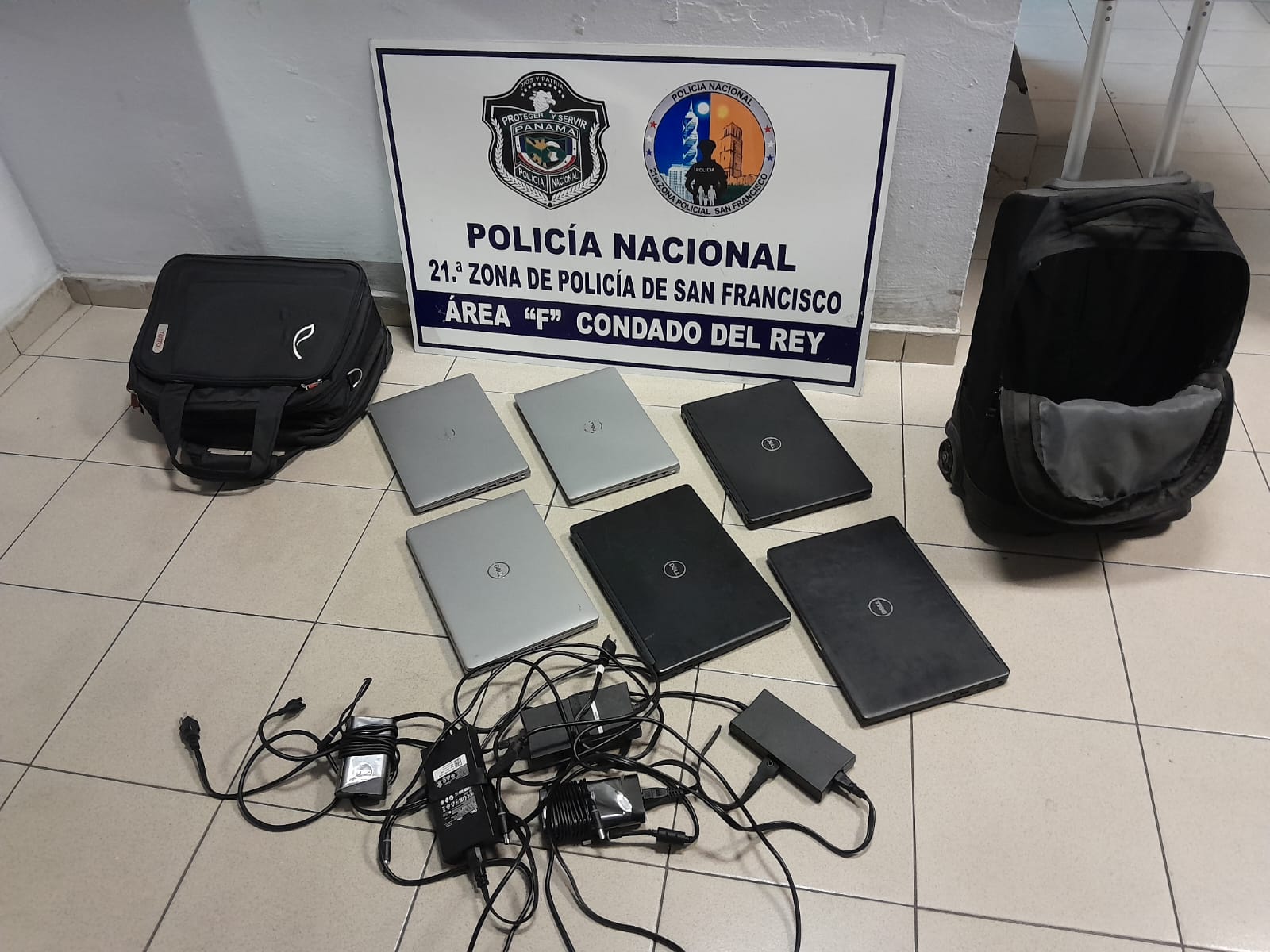 En una rápida acción, las unidades policiales aprehenden a dos hombres, tras ser sorprendidos infraganti cuando intentaban hurtar accesorios y equipos, entre estos 6 computadoras, 5 cargadores de computadora, una mochila negra con ruedas y un portafolio negro, de un local ubicado en el sector de Condado Del Rey. La aprehensión se da luego que las unidades quienes realizaban un patrullaje cerca, recibieran la alerta sobre la actitud inusual de ambas personas, que estaban dentro del local y en la verificación se recuperan los artículos antes mencionados, indicó el Comisionado Juan Arango, jefe de la Zona Policial de San Francisco. Estas personas junto a los indicios serán puestas a órdenes de la autoridades correspondientes. |