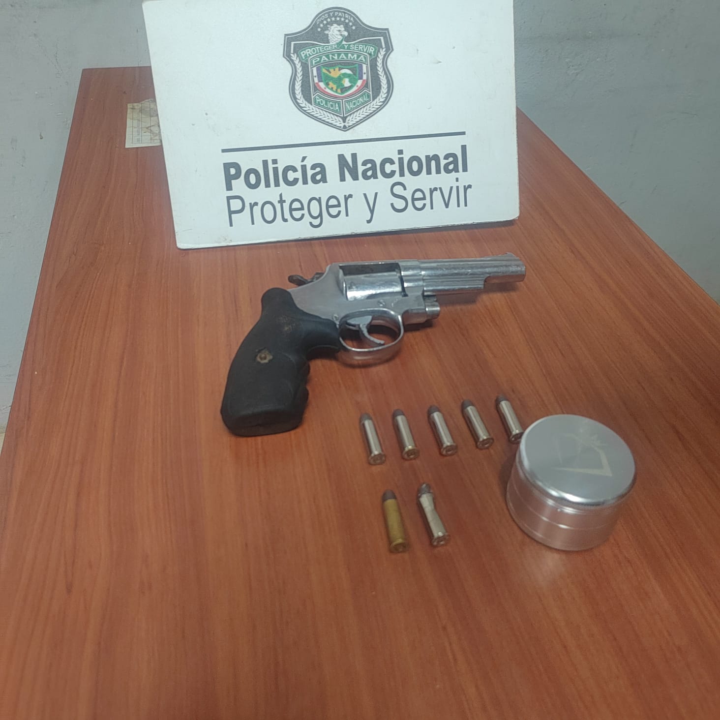 El Comisionado Edgardo Núñez, jefe de la Zona Policial de Don Bosco, dijo que en medio de la acción policial en la residencia, ubicada en la barriada La Siesta, las unidades ubican un revólver cañón largo con serie limada, 7 municiones calibre 38 y un triturador de color gris con residuos de hierba seca que se presume sea sustancia ilícita.