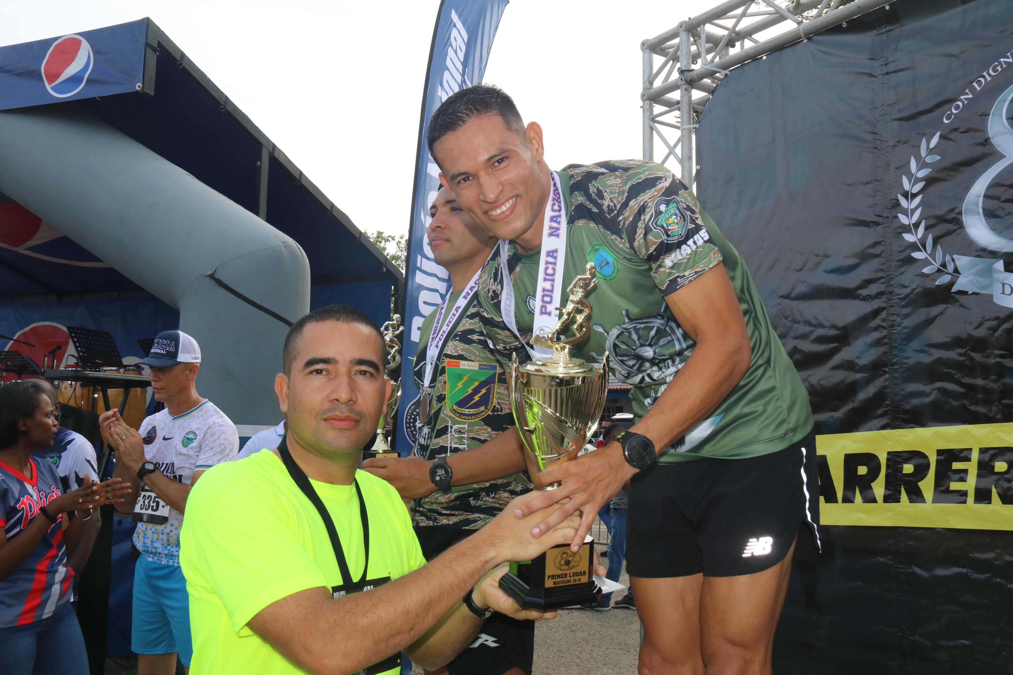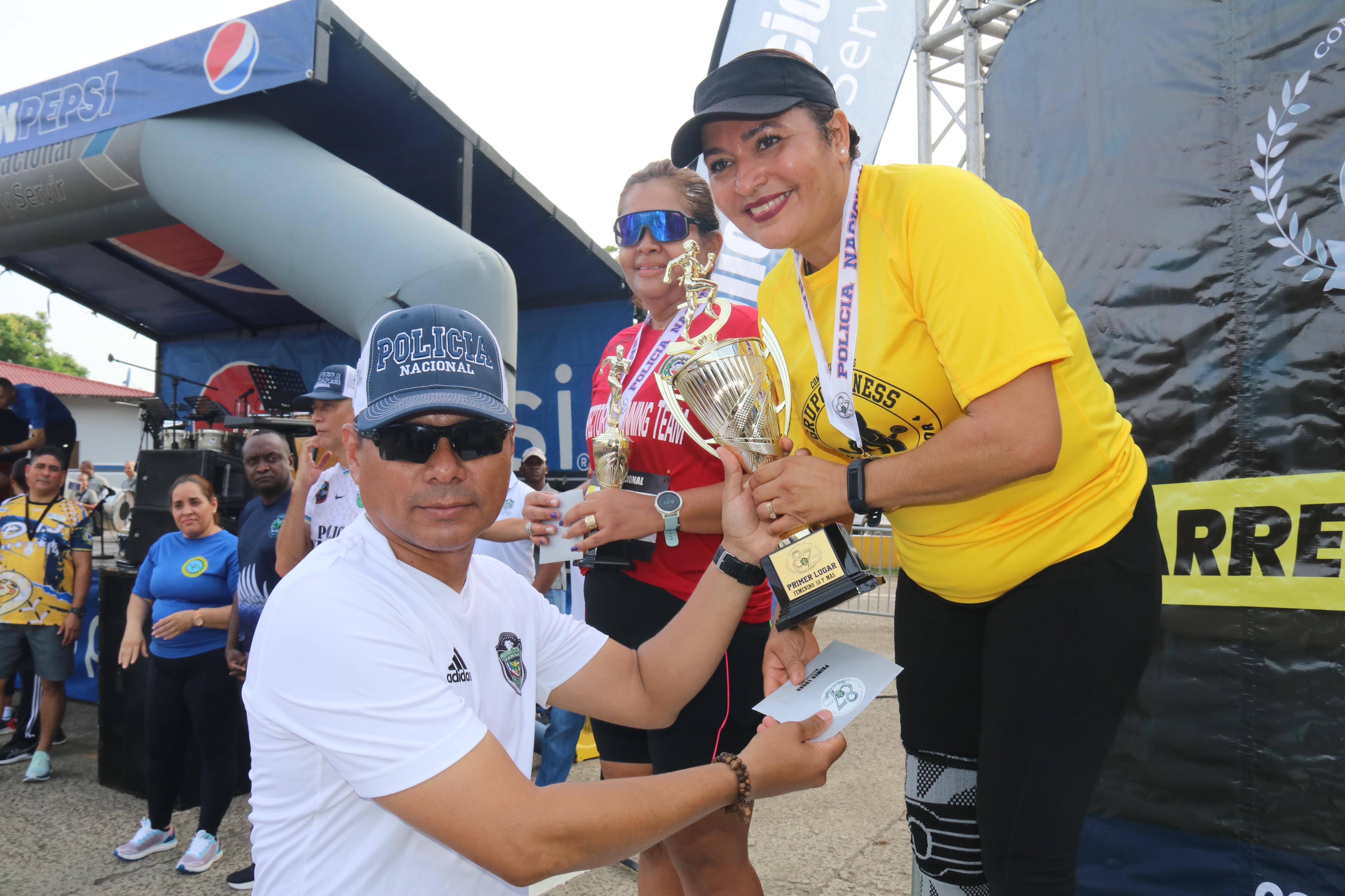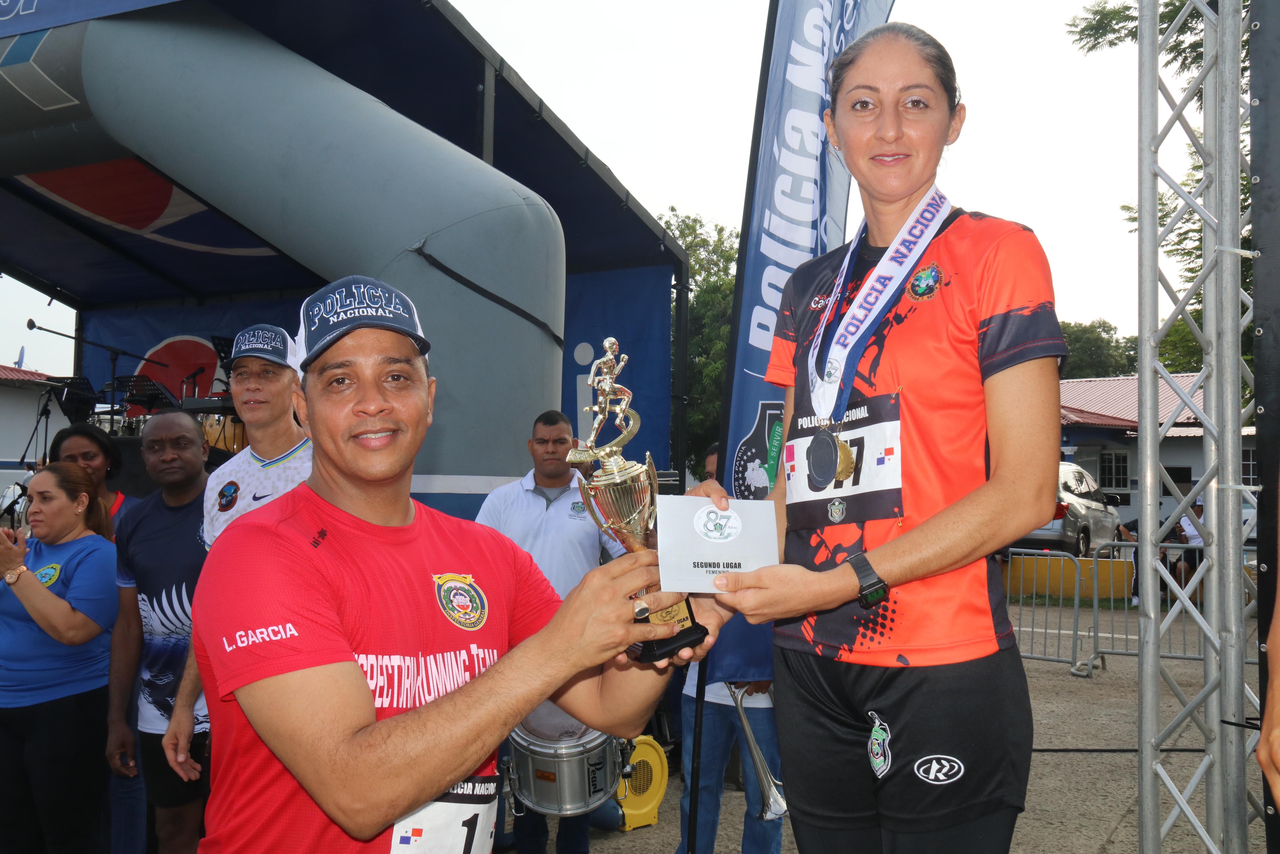 El punto de partida de los 5 kilómetros fue la sede principal de la Policía Nacional ubicada en Ancón, pasando por la rotonda de Diablo y retornando frente a la sede del Tribunal Electoral hasta llegar nuevamente a la sede policial. En la categoría 18 a 29 años, masculina ocupó el primer lugar el Subteniente Luis Bellido de la Unidad Táctica de Operaciones Antidrogas, mientras que en la femenina ocupó el primer lugar la estudiante Zulibeth Álvarez. El Capitán Moisés Gutiérrez de la Unidad Táctica de Operaciones Antidrogas se adjudicó el primer lugar en la categoría masculina de 30-39, en tanto en la categoría femenina el primer puesto fue para la Capitán Eva Pinzón de la Zona Policial de Panamá Oeste. El Sargento Jorge Hernández de la Unidad Táctica de Operaciones Antidrogas ocupó el primer lugar en la categoría 40-49 masculina y en la femenina ganó medalla de oro la Subcomisionada Ana Gallardo de la Dirección de Responsabilidad Profesional. En la categoría 50 años y más el primer lugar fue para el Teniente Jorge Viera y la Mayor Aracelis Ramos. En medio de la actividad reconocieron a la delegación más destacada que fue para el Servicio Policial Motorizado Lince, en Trote Cantado. El Director General John Dornheim y miembros de Directorio Policial realizaron entrega de medallas y obsequios a los ganadores de las diferentes categorías. |