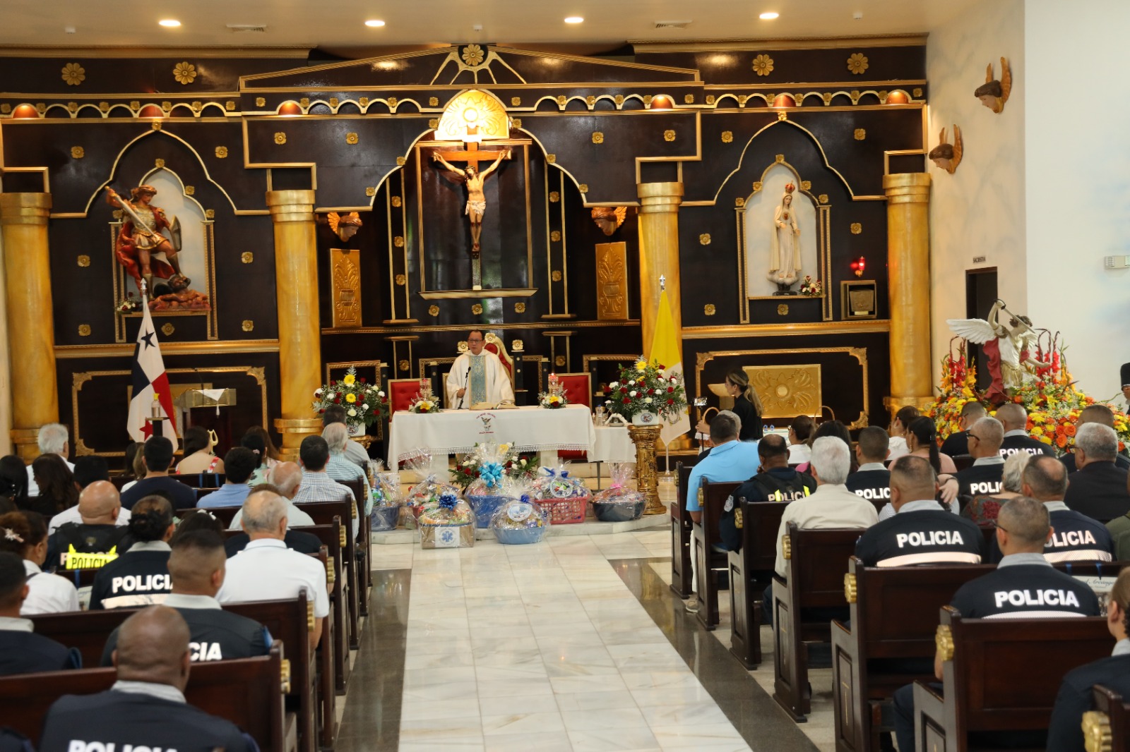 Con la presencia del Director General de la Policía Nacional, Jaime Fernández, en compañía de su equipo de trabajo, unidades policiales de las Direcciones, zonas, y servicios policiales participan en la celebración de una misa en honor a San Miguel Arcángel, Patrono de la Institución. La ceremonia religiosa se realizó en la Capilla de la Policía, localizada en Ancón, donde las unidades policiales en comunidad con invitados especiales fraternizaron por mantener las acciones preventivas y operativas en beneficio de la seguridad pública, en todo el país. La ocasión fue propicia para felicitar al Director Jaime Fernández, acompañados por sus familiares, por la celebración de su honomástico, este domingo 29 de septiembre. |