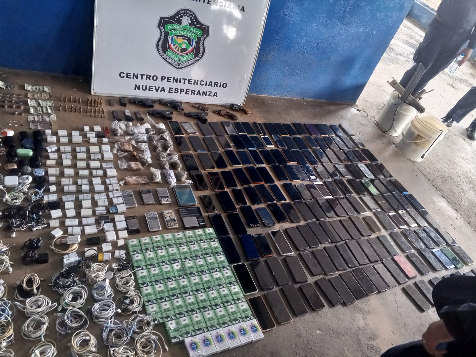 En continuación de la Operación Trébol, se desarrolla la fase 2, a través de una requisa en la cárcel de Nueva Esperanza en la provincia de Colón, donde se mantienen otros miembros de la pandilla "3Namas", ubicando armas, municiones, sustancias ilícitas, equipos tecnológicos y otros objetos prohibidos en estos penales. Entre lo decomisado están 7 armas de fuego que fueron ubicadas en sitios donde se mantienen recluidos integrantes de la estructura criminal judicializada. También proveedores, municiones de diferentes calibres, armas punzocortantes, equipos tecnológicos y presuntas drogas. Otro de los resultados obtenidos en horas de la tarde, fue la aprehensión de otro requerido del grupo pandilleril, alias "El Fat", quien se aprehendió en un cuarto de alquiler en el sector de La Medalla, corregimiento de Cristóbal Este. Con el desarrollo de las dos fases de la Operación Trébol, la Policía Nacional y el Ministerio Público buscan neutralizar los actos delictivos cometidos por esta organización. |