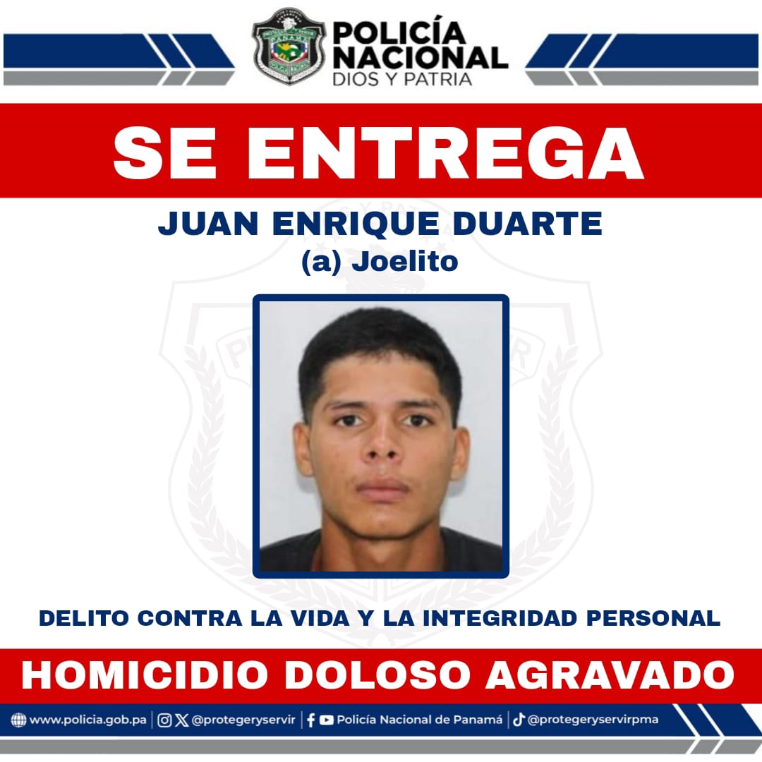 Juan Enrique Duarte alias "Joelito" quien figura como más buscado por delito Contra la Vida y la Integridad Personal en su modalidad de Homicidio Doloso Agravado, fue aprehendido en La Chorrera, luego que se presentará a las instalaciones del Ministerio Público.