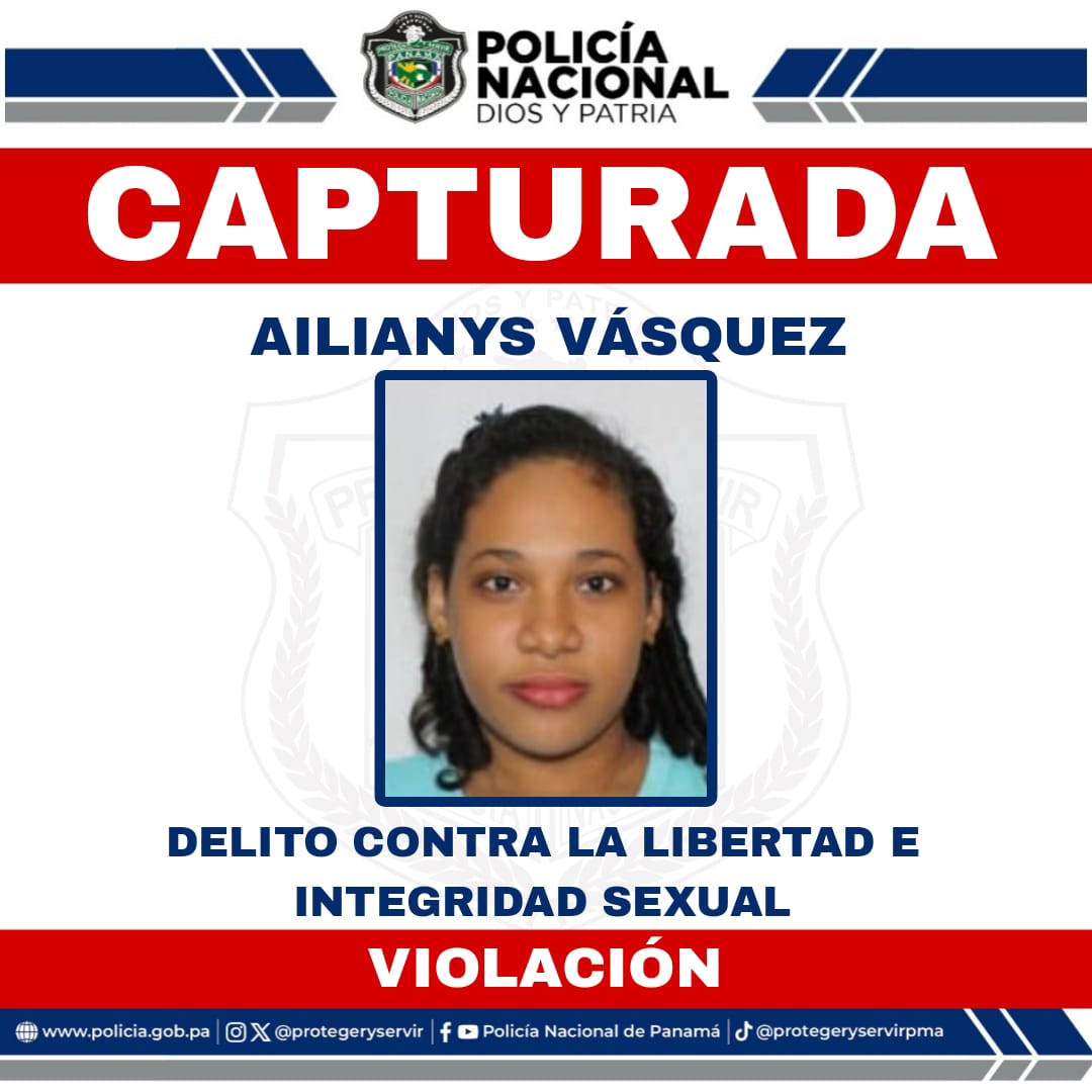 Unidades policiales aprehenden mediante acciones operativas en la provincia de Coclé, a la ciudadana Ailianys Vásquez quien figura como más buscada por delitos Contra la Libertad e Integridad en su modalidad de Violación.