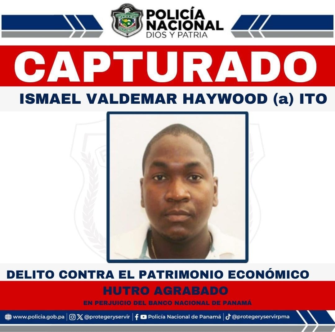 Unidades de la Policía Nacional aprehenden en el corregimiento La 24 de Diciembre, a Ismael Valdemar Haywood alias Ito, quien es uno de los Más Buscados por el Delito Contra el Patrimonio Económico en la modalidad de Hurto Agravado en perjuicio del Banco Nacional.
