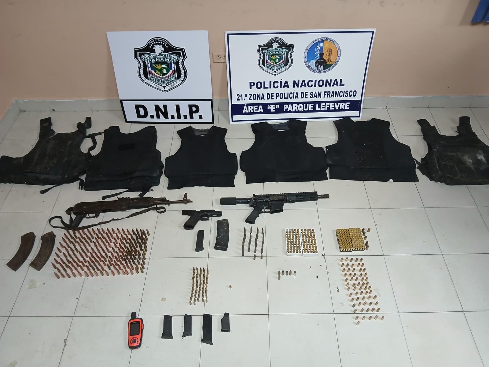 El Comisionado Juan Arango, Jefe de la Zona Policial de San Francisco, indicó que en un depósito abandonado de la planta baja de un edificio, se da con el hallazgo de un Fusil AK-47 con cinco proveedores, 178 municiones 7.62, un Fusil M4 con un proveedor, una pistola glock calibre 45, dos proveedores negros, seis chalecos balísticos color negro, 347 municiones de diversos calibres, un portaproveedor color negro y un radio de comunicación.