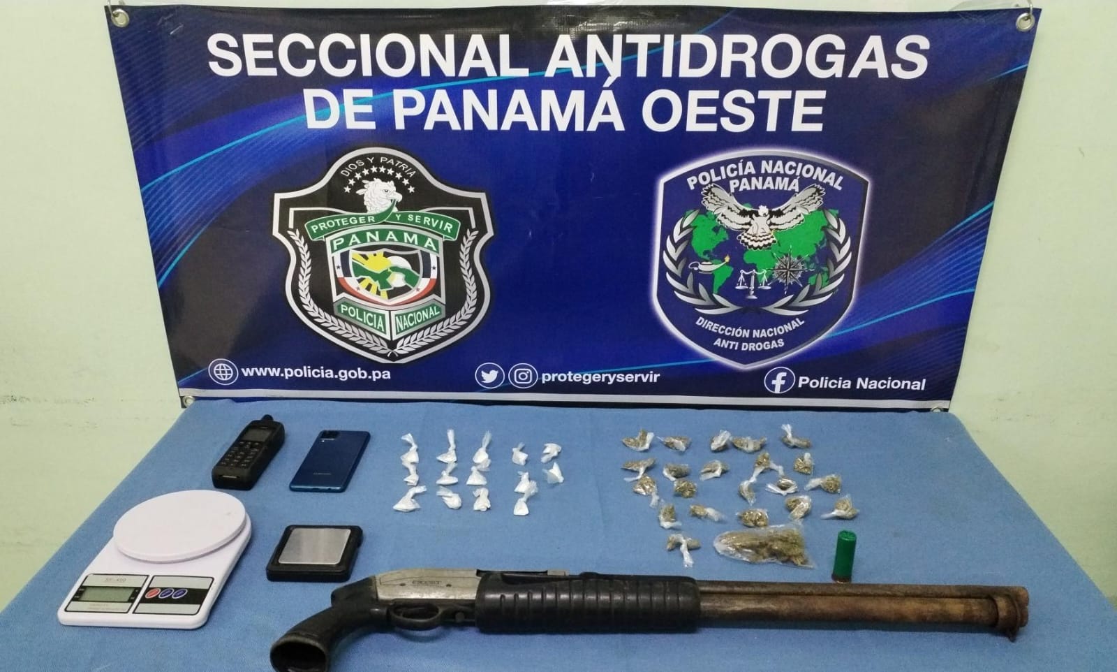 En esta acción policial también se decomisa una arma de fuego tipo escopeta, 14 sobres con presunta droga, 21 sobres contentivo de hierba seca que se presume sea marihuana, dos pesas digitales, teléfono satelital y un celular.