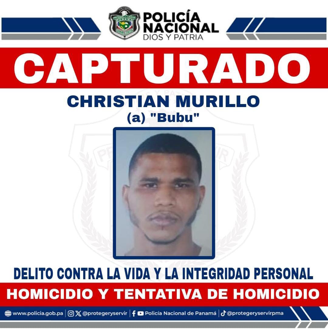Tras labores de investigación, unidades policiales aprehenden en la Barriada Guayacanes, corregimiento de Herrera, distrito de La Chorrera a Christian Murillo, alias "Bubu" quien es uno de los Más Buscados por el delito Contra la Vida y La Integridad Personal en la modalidad de Homicidio Doloso y Tentativa de Homicidio Doloso.