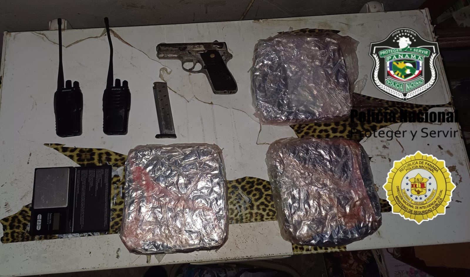 La acción policial fue desarrollada en el corregimiento de Cristóbal Este, donde los uniformados aprehenden a un hombre tras decomisarle tres paquetes de presunta sustancia ilícita, un arma de fuego tipo pistola, un proveedor, pesa digital y radio portátil.