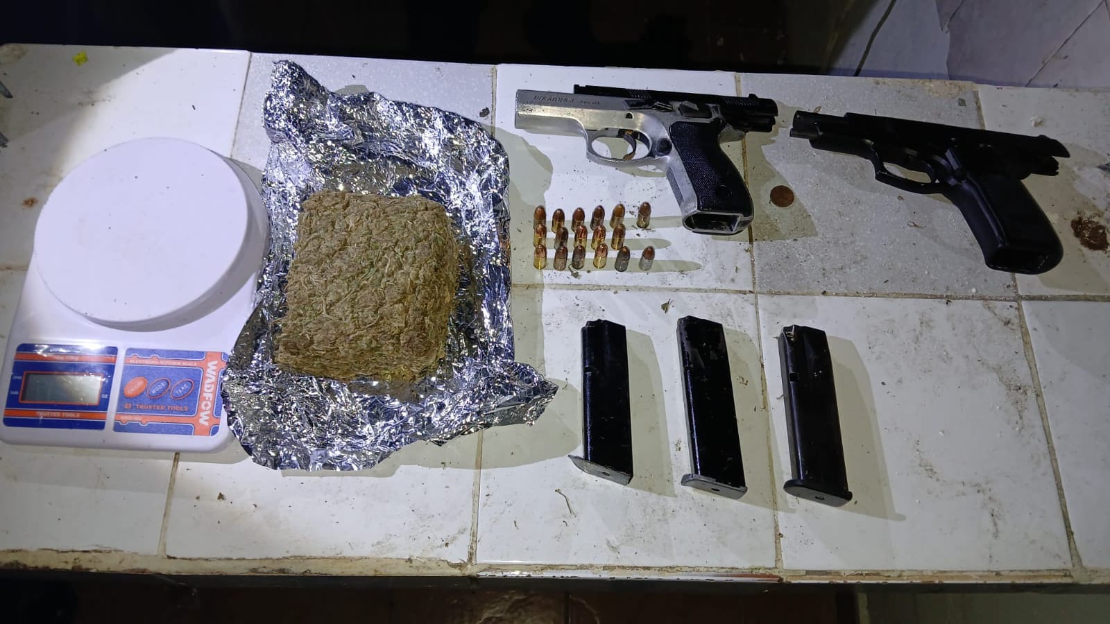 De igual forma se procedió a verificar una residencia abandonada ubicada al final de la vereda donde en la parte superior entre el techo y el cielo raso se logra ubicar dos armas de fuego tipo pistolas calibre nueve milímetros y tres cargadores. Igualmente se ubicaron 17 municiones calibre nueve milímetros además de una bolsa plástica de color gris con cierta cantidad de presunta marihuana y una pesa digital.