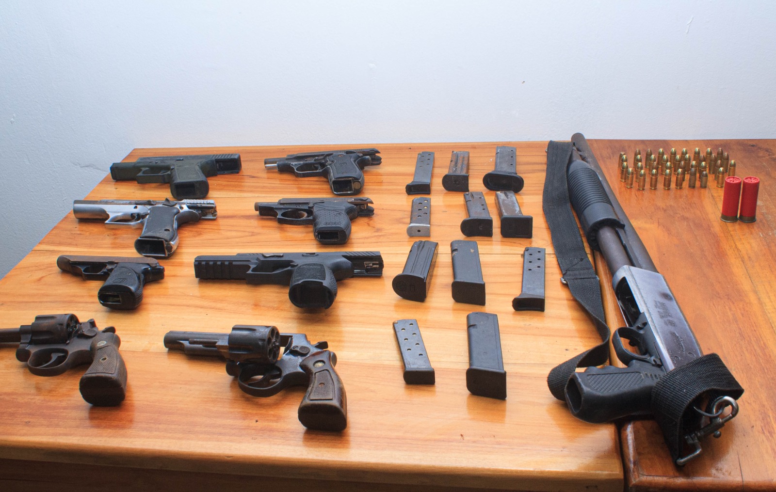 En la diligencia se ubican en total nueve armas de fuego, de estas seis pistolas, dos revólveres y una escopeta, además de 155 municiones de diferentes calibres, un paquete rectangular contentivo de presuntas drogas y once proveedores.