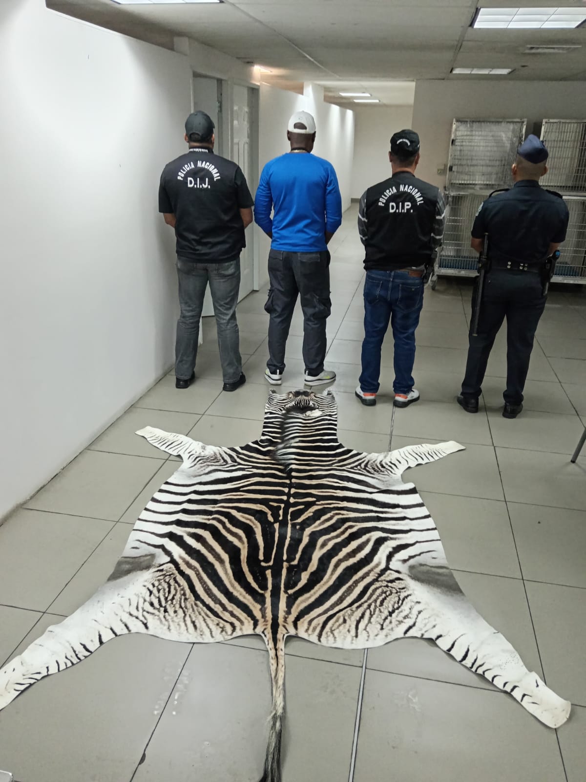 Mediante acciones operativas realizadas por la sección contra delitos ambientales de la Policía Nacional en conjunto con autoridades en mi ambiente decomisan una piel de cebra en el Aeropuerto Internacional de Tocumen.