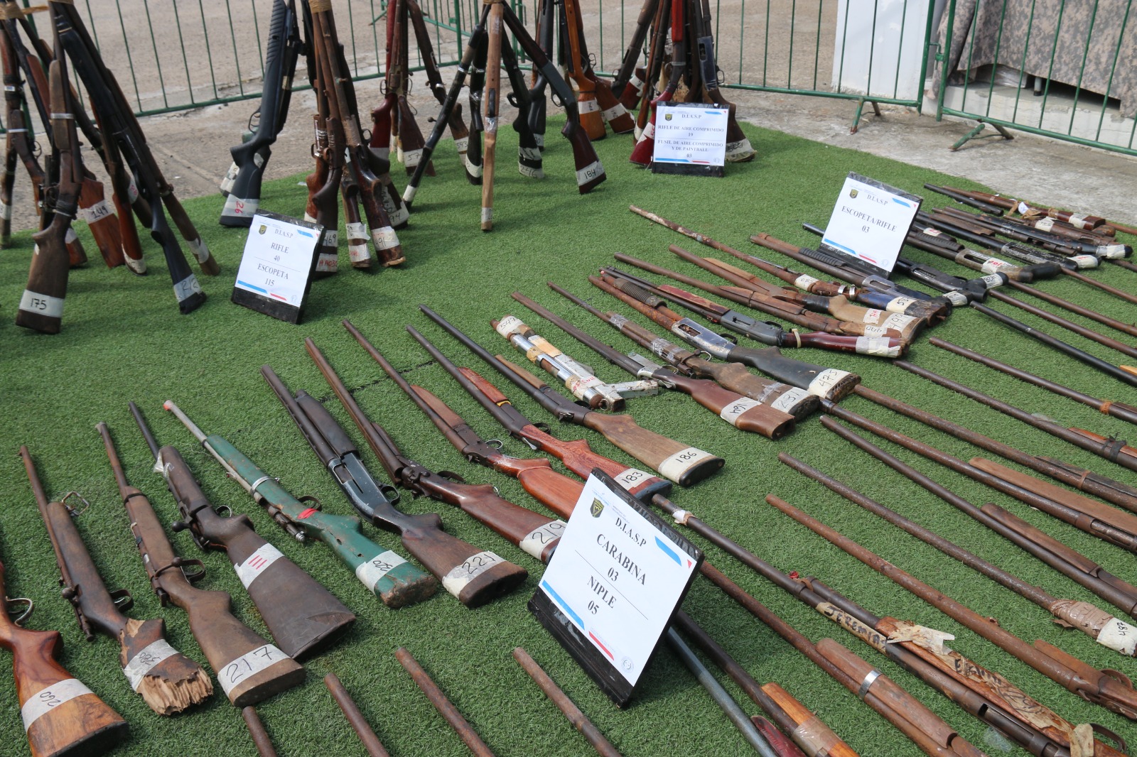 El desglose detalla:196 pistolas, 178 revólveres, 115 escopetas, 40 rifles, 5 niple, 18 fusiles, 7 subametralladoras, 3 carabinas, 19 rifles de aire comprimido, entre otras, incautadas en diferentes acciones operativas.