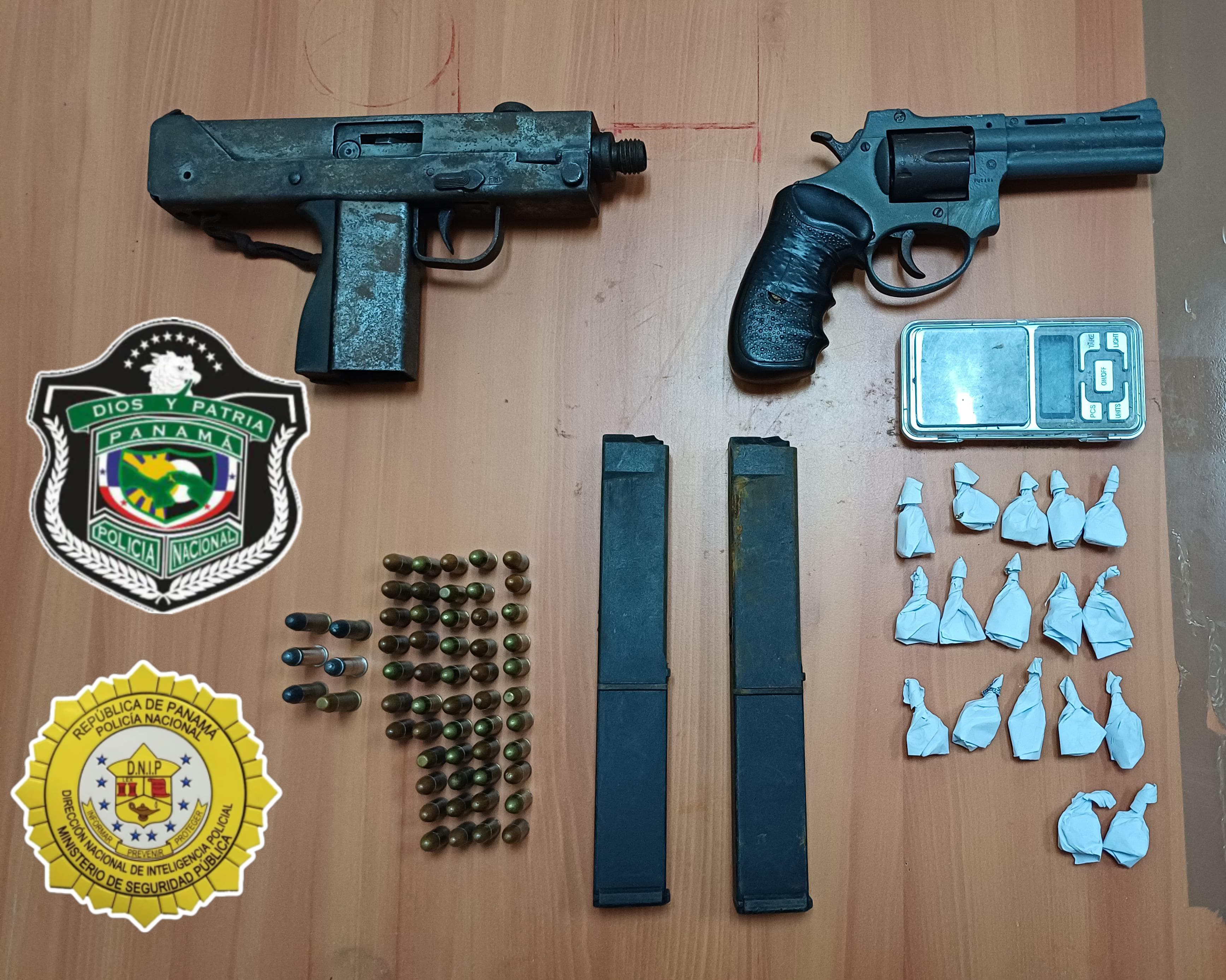 El resultado de esta diligencia en Altos de Los Lagos, fue el decomiso de una Mini Uzi, un arma de fuego tipo revolver, dos proveedores, municiones, presunta sustancia ilícita y una pesa digital.