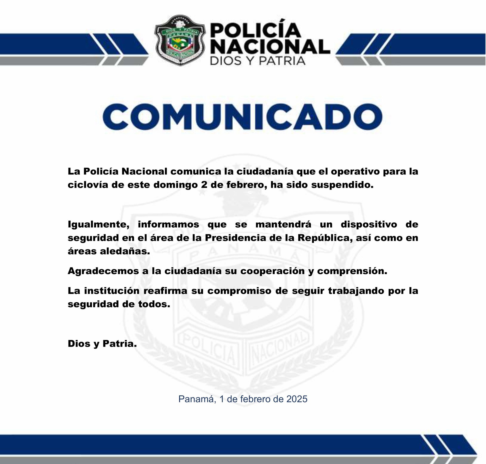 La Policía Nacional comunica la ciudadanía que el operativo para la ciclovía de este domingo 2 de febrero, ha sido suspendido.