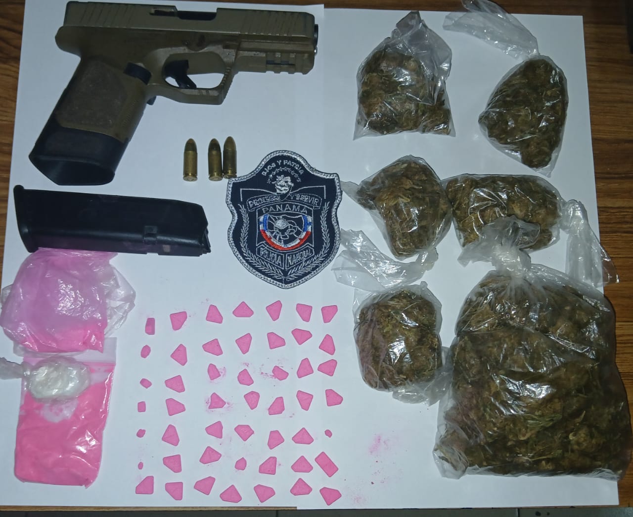 Esta acción policial se da luego que estas personas, intentaron darse a la fuga y se le decomisa un arma de fuego tipo pistola con su respectivo proveedor y municiones, también 6 bolsas contentivo material vegetal que se presume sea la droga conocida como marihuana y sustancia de color rosada conocida como tusi.