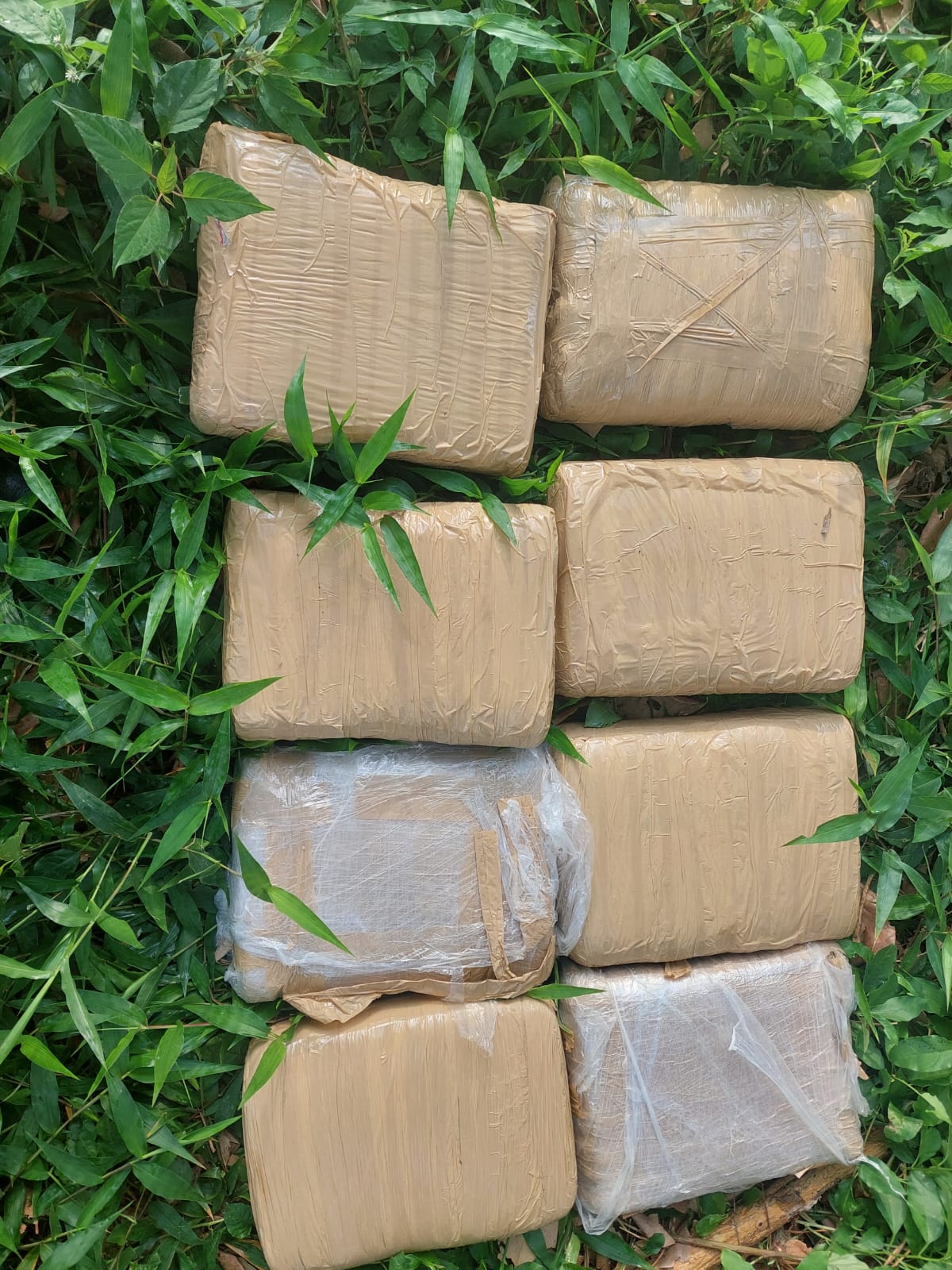 Al momento de hacer las verificaciones logran observar que dentro del saco se mantenía ocho paquetes rectangulares forrados con cinta adhesiva de color chocolate que se presume sea droga.