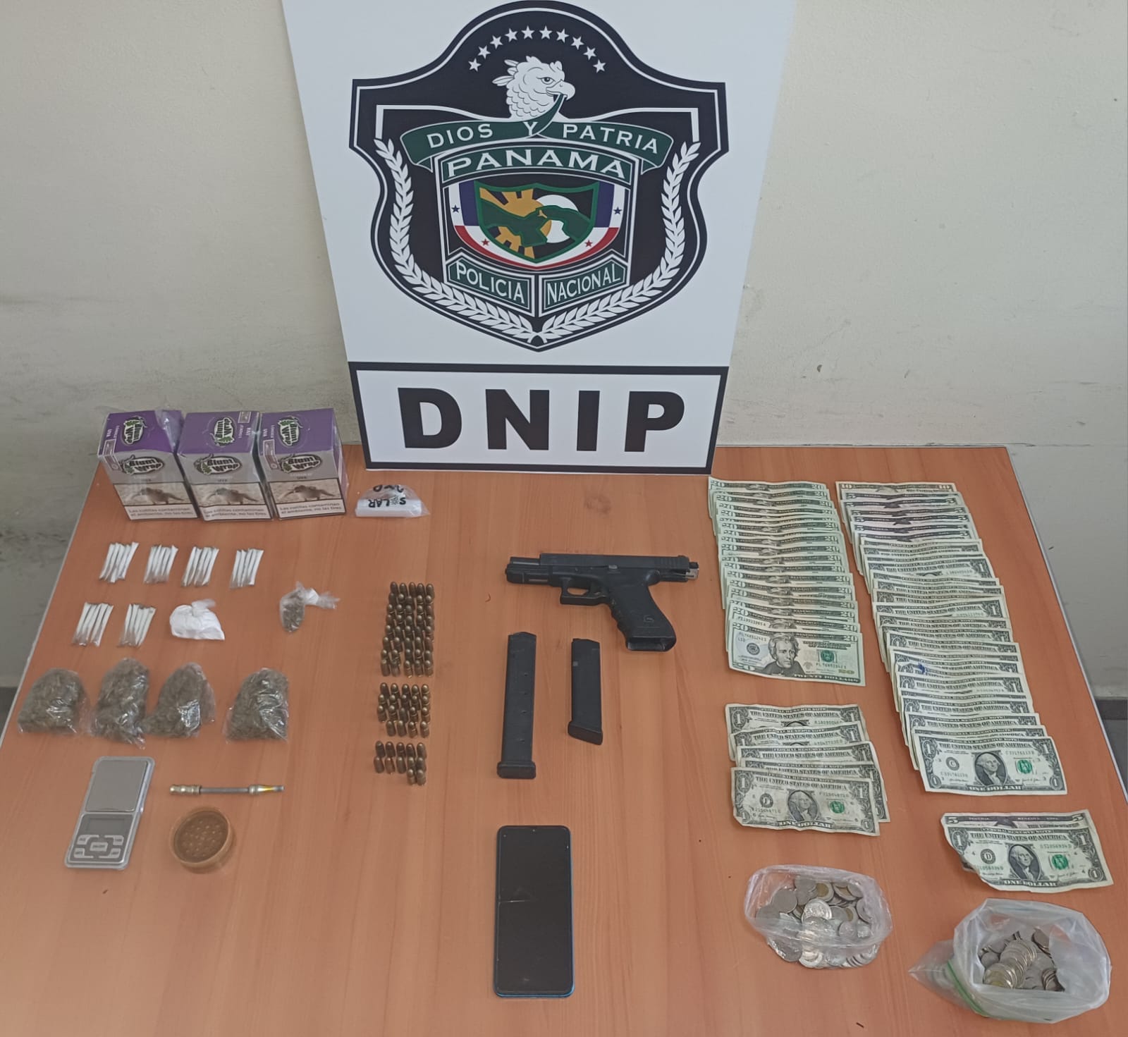 Siguiendo los lineamientos del Plan Firmeza, unidades de la Policía Nacional en asocio con el Ministerio Público aprehenden a una persona de 50 años y le decomisa un arma de fuego, proveedor, municiones, presunta droga, dinero en efectivo, una pesa digital y equipo tecnológico.