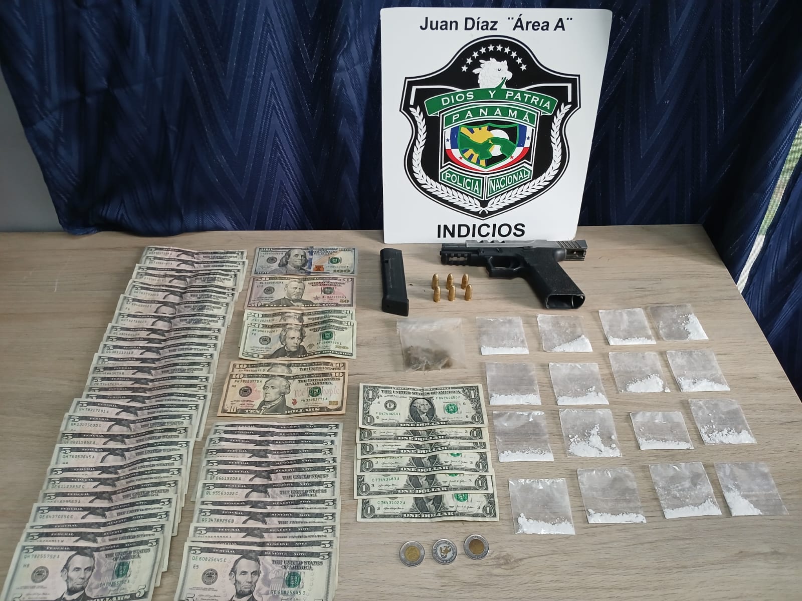 Siguiendo los lineamientos del Plan Firmeza, unidades de la Policía Nacional en asocio con el Ministerio Público, aprehenden a una persona de 21 años, se le decomisa un arma de fuego, proveedor, municiones, presunta droga y B/ 415.00 en efectivo.