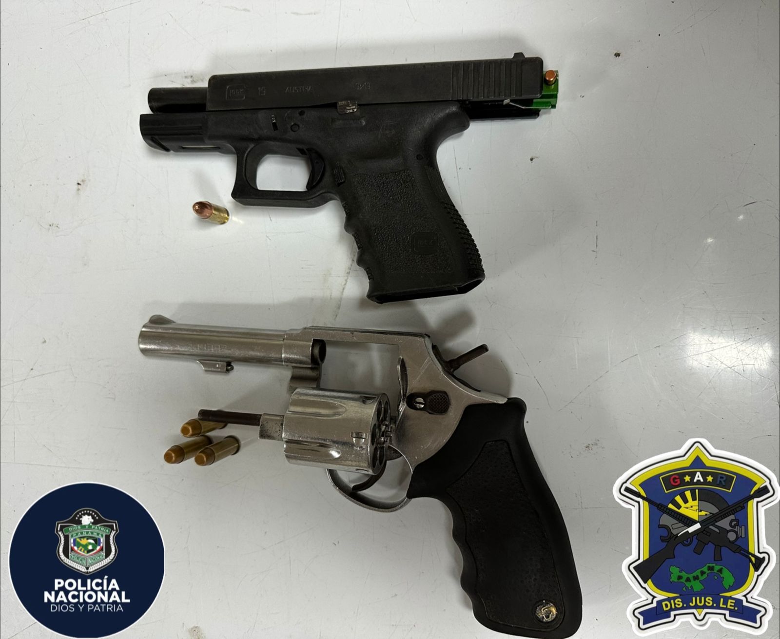 Se aprehendió a un ciudadano de 32 años de edad, el cual arroja un revólver, calibre 38 especial, con 3 municiones. También se capturó a otro ciudadano de 33 años que huía entre la muchedumbre, portando una pistola, 9mm, serie limada y una munición.