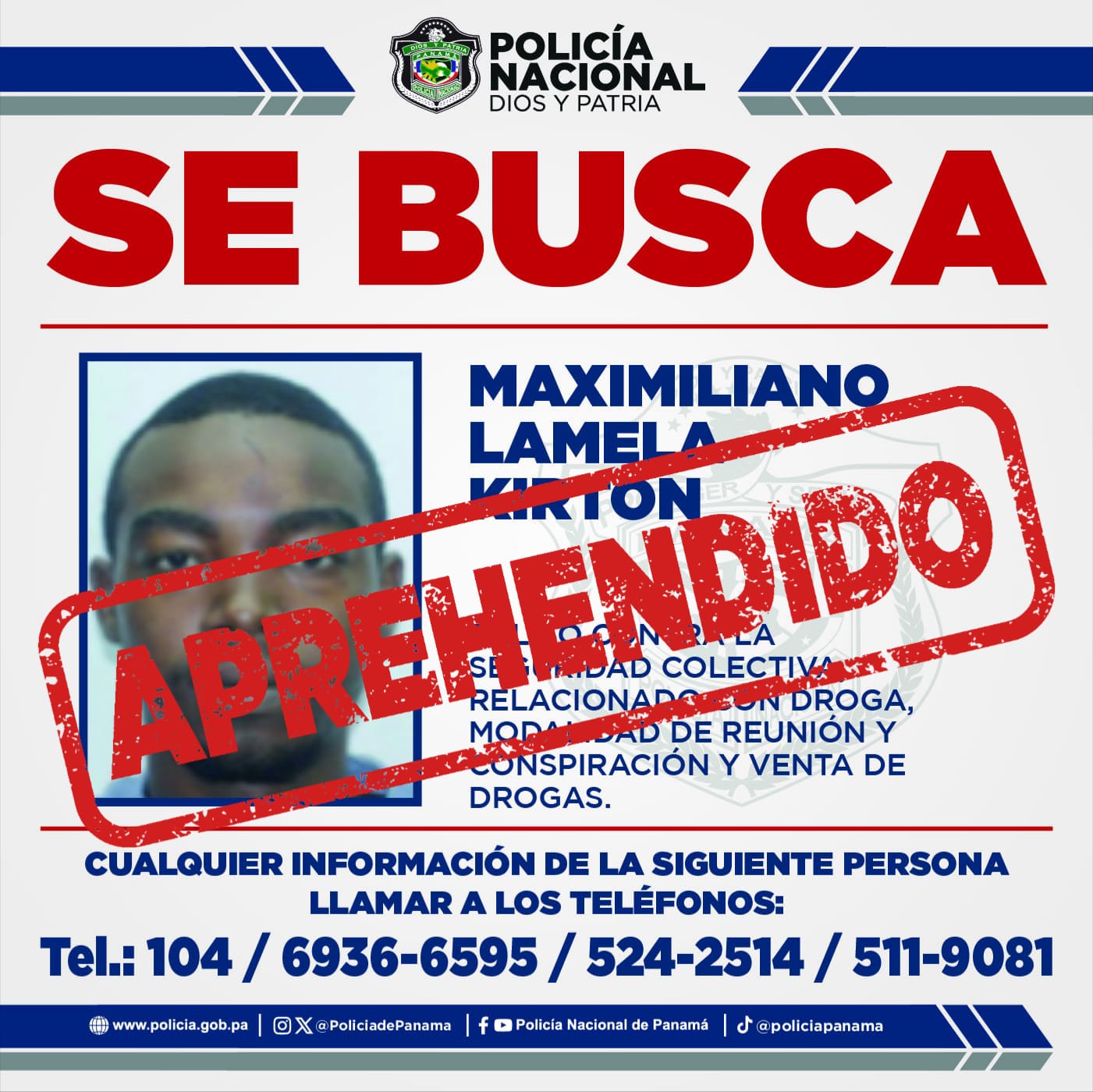 Como parte del Plan Firmeza, la Policía Nacional en el corregimiento de Río Abajo, aprehende a Maximiliano Lamela Kirton alias Culi, quien figura en la lista de los más buscados por el delito relacionado con droga en la Operación Hipoxia.