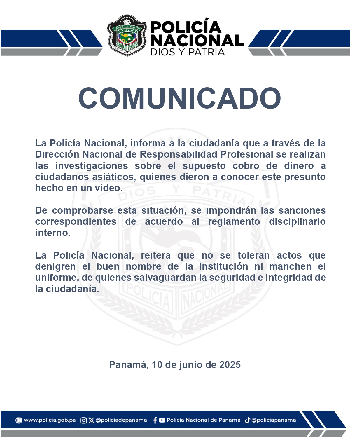 La Policía Nacional, informa a la ciudadanía que a través de la Dirección Nacional de Responsabilidad Profesional se realizan las investigaciones sobre el supuesto cobro de dinero a ciudadanos asiáticos, quienes dieron a conocer este presunto hecho en un video.