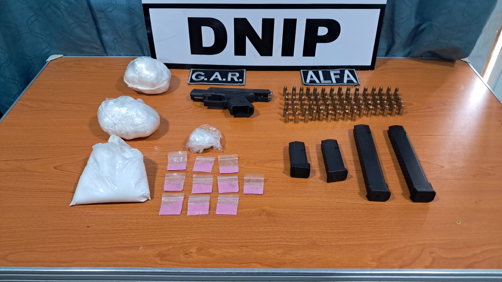 En una diligencia de allanamiento y registro realizada en el corregimiento de Río Abajo, la Policía Nacional, en coordinación con el Ministerio Público, logró incautar un arma de fuego tipo pistola, varios proveedores y municiones, así como presunta sustancia ilícita.