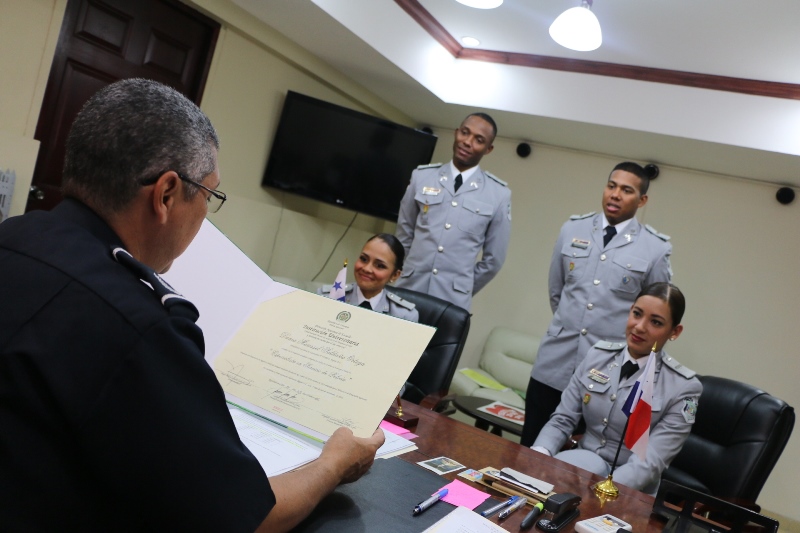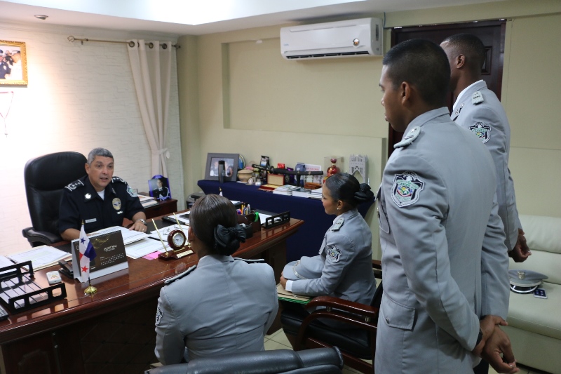 La mañana de este martes 29 de noviembre se incorporaron a las filas de la Policía Nacional, cuatro egresados de la República de Colombia, tras culminar sus estudios en la Escuela de Cadetes de Policía General Santander, Luego de finalizar este largo periodo regresan a suelo panameño bajo el rango de Subteniente. Entre estos nuevos oficiales se encuentran Oderay Vega Atencio, Carlos Bustamante Rodríguez con el título académico de pregrado en Administración Policial y Celso Franco, Dania Saldaña en el programa académico de Especialización en Servicio de Policía. Los mismos fueron recibidos, en la Secretaria General de la Policía Nacional, por el Comisionado Manuel de León, secretario general de esta institución, quien felicito el desempeño de estas destacadas unidades. |