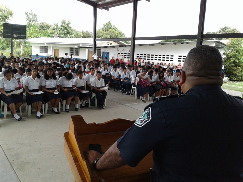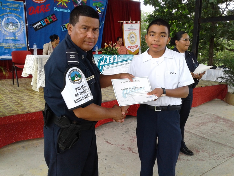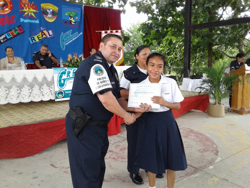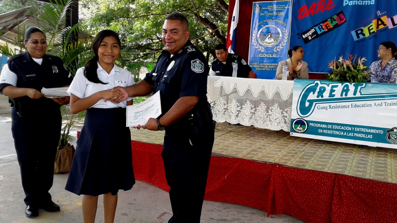 Con gran satisfacción unos 200 alumnos de VII nivel del Centro escolar Federico Zúñiga Feliu, ubicado en la ciudad de Penonomé, finalizaron el Programa de Educación y Entrenamiento en Resistencia a las Pandillas G.R.E.A.T., por sus siglas en inglés, el cual es impartido por el Servicio de Niñez y Adolescencia en Coclé. Durante tres meses, la cabo Eira Villagra compartió con los jóvenes estudiantes las lecciones que incluye el programa creando conciencia sobre el riesgo que corren al pertenecer a grupos delincuenciales. La ceremonia final del programa se dio en la cancha techada del centro educativo, con la participación del jefe de la Zona Policial el comisionado Aníbal Prados, la subdirectora del Centro educativo la profesora Neusa de Pinzón, la profesora Violeta de Sandoya supervisora del Ministerio de Educación, administrativos y padres de familias. La actividad contempló agradecimiento, coreografía, cantos, coral y entrega de certificados a los estudiantes del VII nivel. Es importante mencionar que el comisionado Prados, manifestaba que realmente es satisfactorio el trabajo que se ha realizado, donde alrededor de 16 escuelas y un total de 2200 estudiantes han sido beneficiado con los programas de la Policía Nacional en la provincia de Coclé, siempre con el objetivo de orientar para que los estudiantes tomen las mejores decisiones, detallaba Prados. En tanto la profesora Neusa Pinzón subdirectora del centro educativo, expresaba que el programa es de beneficio porque, mejora las relaciones entre la policía y la comunidad educativa, ya que vemos a las unidades, como parte de la escuela, donde sus docencias permiten a los estudiantes moldear actividades para la vida tanto en la escuela como en el hogar. Agradeció en nombre de todos los presentes por el trabajo que realiza la Policía Nacional en pro de nuestros estudiantes, para que sean hombres y mujeres de bien diciendo "NO" a las pandillas y drogas.