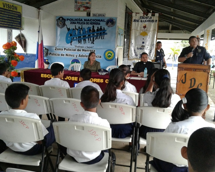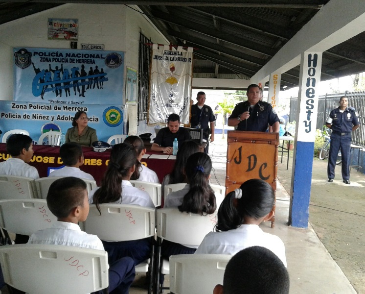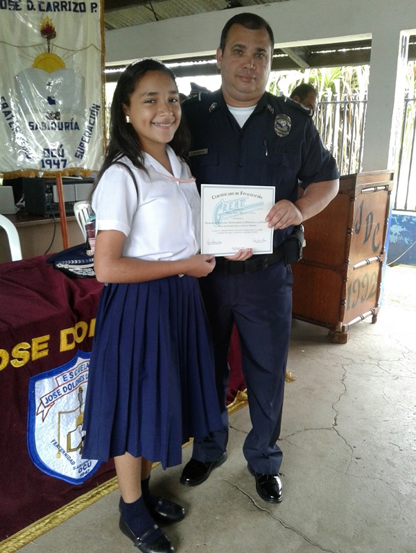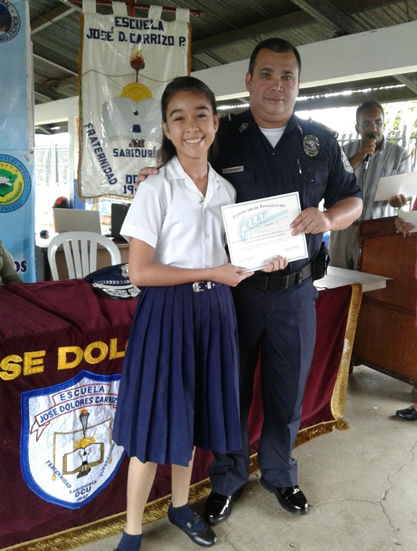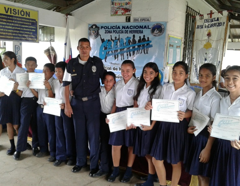 Un total de 92 estudiantes de la Escuela primaria José Dolores Carrizo del distrito de Ocú, recibieron certificado del Programa Educación Entrenamiento en Resistencia a las Pandillas (GREAT) de la Policía Nacional en la provincia de Herrera. En el acto estuvo el comisionado Ismael Herrera Delgado, Jefe de la Zona de Policía de Herrera, acompañado de su equipo de trabajo de la sección de la Niñez y Adolescencia y funcionarios del Ministerio de Educación Es importante mencionar que el jefe policial se dirigió a todos los estudiantes para felicitarlos; al igual que orientó al presente con el tema de la pandilla y los exhortos a continuar alejándose de este flagelo. La Sexta Zona Policial continuará con los programas de Desarrollo Humano en toda la provincia. |