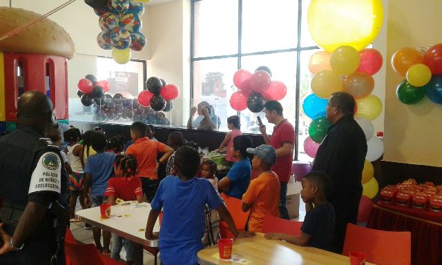 Un total de 50 niños y niñas de escasos recursos, disfrutaron en horas de la tarde de este viernes 16 de diciembre de un agasajo organizado por unidades de Niñez y Adolescencia de la zona policial de Colón. La actividad se realizó en un restaurante de comida rápida, ubicado en la calle 13 avenida Meléndez, donde los niños disfrutaron de juegos piñatas y la cajita feliz. el comisionado José Ubarte, ejecutivo de la zona señaló que con este tipo de actividades la Policía Nacional busca llevar alegría a los niños y más en esta época especial como o es la navidad, donde celebramos el nacimiento de Jesucristo.