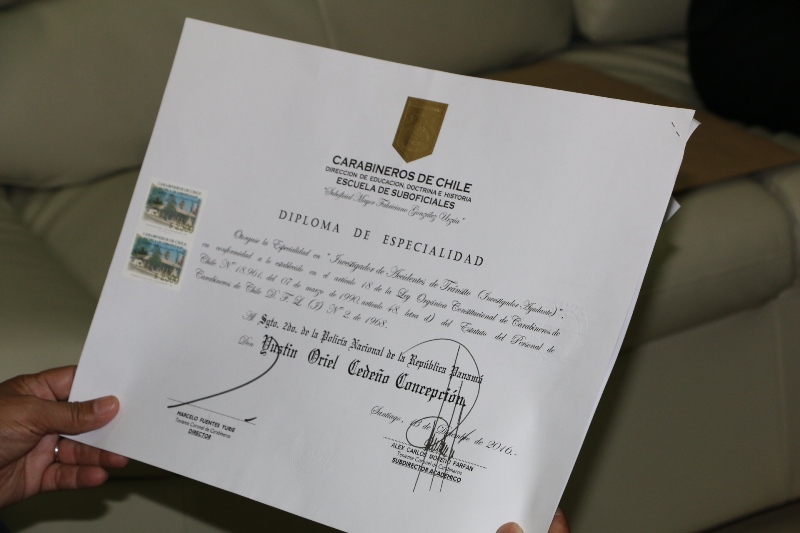Unidades de la Policía Nacional ampliaron sus conocimientos al participar en el curso de Investigador de Accidentes de Tránsito, dictado en la Escuela de Suboficiales de Carabineros “Suboficial Mayor Fabriciano González Urzúa”, en Santiago de Chile. La capitán Yamileth Castillo, de la Dirección Nacional de Docencia junto al sargento 1° Yustin Cedeño y la cabo 2° Melisa Cortez, de la Dirección Nacional de Operaciones de Tránsito (DNOT) fueron capacitados desde el 1 de agosto hasta el 20 de diciembre en este curso que les permite ser investigadores ayudantes o auxiliares. Durante esta capacitación fueron instruidos en la elaboración de informes periciales de tránsito, planimetría y mecánica, entre otros elementos fundamentales en la reconstrucción de un accidente. Con estas herramientas y conocimientos prácticos y teóricos, los agentes de la DNOT de la Policía Nacional podrán sustentar de manera científica las posibles causas de un accidente. Así mismo reconocer los puntos que pueden ser de mayor riego para los conductores. A su llegada ambos uniformados presentaron sus certificados como nuevos logros en su carrera ante el Secretario General y comisionado Manuel De León, quien los felicitó y exhortó a continuar profesionalizándose.
