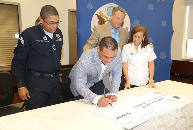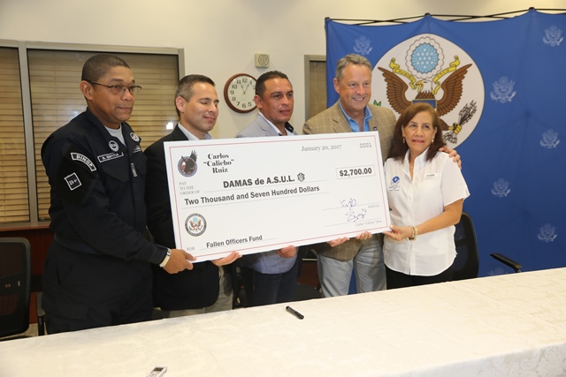 La Asociación Damas A.S.U.L de la Policía Nacional recibieron de manos del jugador de grandes ligas Carlos “Calicho” Ruiz y La Asociación de Oficiales de Comando de la Policía Hispanoamericana (HAPCOA) una significativa donación, para continuar con su noble labor que realizan en favor de las unidades de la entidad. La entrega de esta donación que se llevó a cabo en la Embajada de Estados Unidos en Panamá, se trata de una donación semilla (primer aporte) que será utilizada para familiares de uniformados caídos en el cumplimiento del deber. Durante la ceremonia de entrega también estuvieron presentes el Embajador de los Estados Unidos en Panamá John Feeley, Representante de HAPCOA Julio Burgos, integrantes de Damas A.S.U.L y miembros del Directorio de la Policía Nacional. “Para mí es un orgullo y me llena de gran satisfacción brindar esta ayuda, ya que perdí a mi papá a los siete años, quien perteneció a la Policía y se las carencias que paso mi madre para sacarnos adelante”, dijo el beisbolista, Carlos Ruiz. La señora Aurora Jurado quien es parte de las Damas A.S.U.L, en representación de la presidenta Nacelys de Pinzón, comentó que la familia es esencial para el Policía y este tipo de donaciones ayuda en mucho a la vez que las motiva a seguir ayudando. |