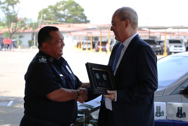 La invocación religiosa y bendición de los vehículos y equipos donados estuvo a cargo del Capellán de la Policía Nacional, Edgar Flores. Luego el director General Omar Pinzón hizo entrega de un cuadro simbólico que en su interior mantenía una réplica de la placa y emblema policial al Embajador de Republica de Alemania.