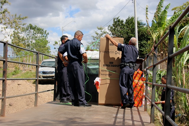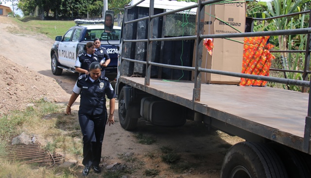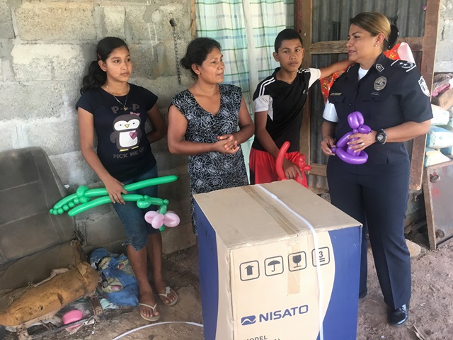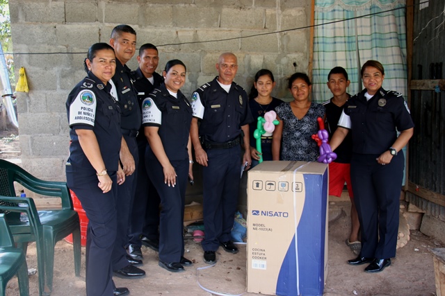 Las unidades de la Policía Nacional de servicio en la Policía de Niñez y Adolescencia viajaron hasta el área de Las Margaritas de Atalaya en Veraguas, para entregar artículos de cocina a una familia humilde, como parte de la labor que llevan a cabo los uniformados de colaborar con quienes más lo necesitan. Desde muy temprano las unidades de este servicio de la principal institución de seguridad del país, viajaron hasta Atalaya para entregarle a la señora Marilyn Castillo una refrigeradora y estufa, para mejorar un poco su calidad de vida. Allí los esperaba la señora Marilyn junto a sus dos hijos Yeylín Santos Castillo, de 12 años y Bladimir Santos Castillo en el portal de una humilde casa de zinc pero con un calor familiar tremendo. La Subcomisionada Ayda Villarreal jefa del Servicio de Policía de Niñez y Adolescencia destacó el significado que tiene para las unidades de la Policía Nacional colaborar un poco con familia como los Santos Castillo, personas que a pesar de sus necesidades han sabido seguir adelante. “Nos llena de mucha alegría estar aquí con ustedes y traerles un poco de alegría, porque sabemos sus necesidades y queremos ayudar con un granito de arena, ustedes son nuestro compromiso como Policía Nacional” destacó Villarreal. Yeylin y Bladimir son parte del Programa de Prevención de Educación para la Resistencia al Uso y Abuso de las Drogas y la Violencia (D.A.R.E) que lleva adelante la Policía Nacional a través del Servicio de Policía de Niñez y Adolescencia.