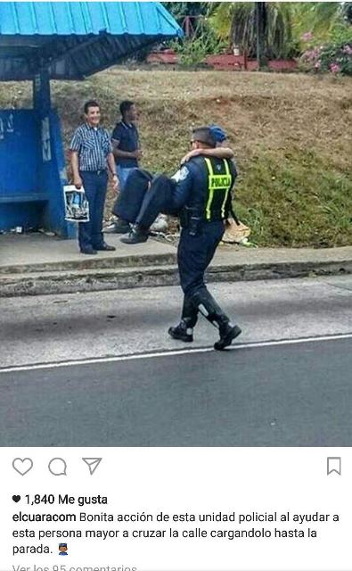 “Es precisamente la labor que desempeñamos, la de brindar seguridad a la ciudadanía, es nuestro lema: Proteger y Servir, y para eso estamos”, dijo el subcomisionado de la Policía Nacional, Franklin Serrano en el programa matutino “Jelou”, transmitido en la Televisora Nacional (TVN). Y es que este oficial, fue aplaudido a través de las redes sociales, luego que cargara en sus brazos a un adulto mayor, a quien se le dificultaba cruzar la vía Panamericana. El Subcomisionado Franklin Serrano de servicio en la Dirección Nacional de Operaciones de Tránsito de la Policía Nacional, en el área Oeste, narró que realizaba un recorrido por el sector de El Nazareno en La Chorrera, cuando se percató que el ciudadano no podía cruzar, y fue cuando sin pensarlo dos veces, se bajó de su motocicleta, detuvo el tráfico y lo cargó dejándolo en la parada. Serrano dijo que testigos del hecho se mostraron contentos por este gesto solidario, pero jamás pensó que hoy él sería el protagonista de esta historia que nos enseña a cuidar de nuestros semejantes. “Hago un llamado a los familiares de los adultos mayores a no dejarlos solos, y menos en momentos tan peligrosos como lo es cruzar una vía tan concurrida”, recomendó el subcomisionado Serrano. Quienes fueron testigos de este momento, captaron la fotografía que se volvió viral en las redes sociales y fueron muchos los usuarios quienes la compartieron con sus seguidores. La imagen causó buena impresión, en la mayoría de los comentarios felicitando al uniformado por su buena acción.