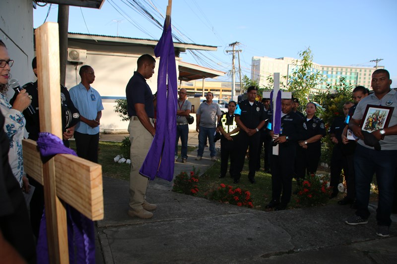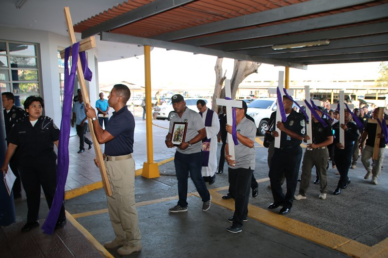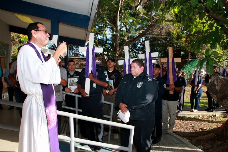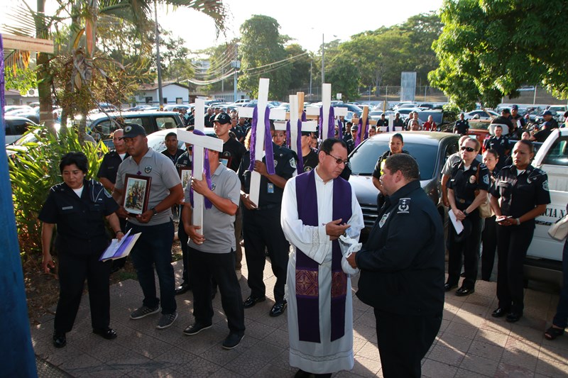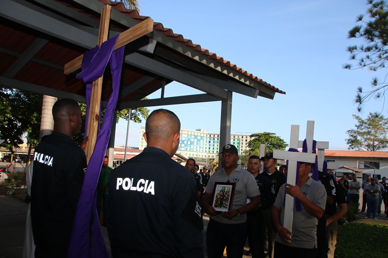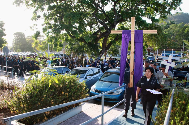 Con fe y profunda meditación, el personal juramentado y no juramentado de la Policía Nacional participó del primer Vía Crucis, como preparativo previo a la Semana Santa. Los participantes recorrieron las “15 Estaciones de la Cruz”, que fueron ubicadas en las entradas de los departamentos y direcciones de la sede policial en Ancón y que relatan los momentos vividos por Jesús, su recorrido con la cruz hasta su crucifixión, sepultura y resurrección. El padre Edgar Flores, capellán de la Policía Nacional manifestó que este acto penitencial, es una ofrenda a Dios que nos invita a prepararnos y fortalecernos espiritualmente, a convertirnos en mejores personas. “Este acto nos recuerda el amor de Dios hacía con nosotros y que nos enseña, en uno de estos pasajes que podemos hacer frente a la adversidad y levantarnos si caemos en momentos difíciles, así como Cristo cayó 3 veces llevando la cruz y se levantó para seguir su caminar”, evocó el padre Flores. Este Vía Crucis, es el primero de cinco que se realizaran cada viernes, siendo el último el 7 de abril. |