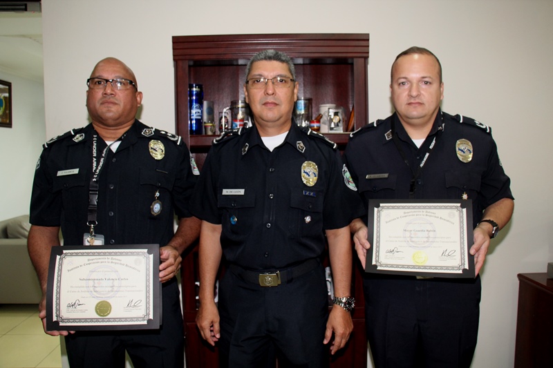 Dos oficiales de la Policía Nacional presentaron ante el Secretario General de la institución, Manuel De León sus certificados tras culminar el curso de “Análisis de Inteligencia de Operaciones Transnacionales” realizado en el Instituto de Cooperación para la Seguridad Hemisférica (WHINSEC), ubicado en el Fuerte Benning, Georgia, Estados Unidos. En esta capacitación que se realizó del 18 de enero al 16 de marzo en módulos teóricos y prácticos, los uniformados panameños junto a miembros de instituciones de seguridad de otros países de la región latinoamericana se especializaron en analistas en asuntos relacionados al narcotráfico y terrorismo, toma de decisiones, derechos humanos, democracia y otros temas. El Secretario General, Manuel De León los felicitó por haber obtenido altos puntajes y sumar un nuevo logro en su vida profesional que contribuirá a fortalecer la labor de la Policía Nacional. |