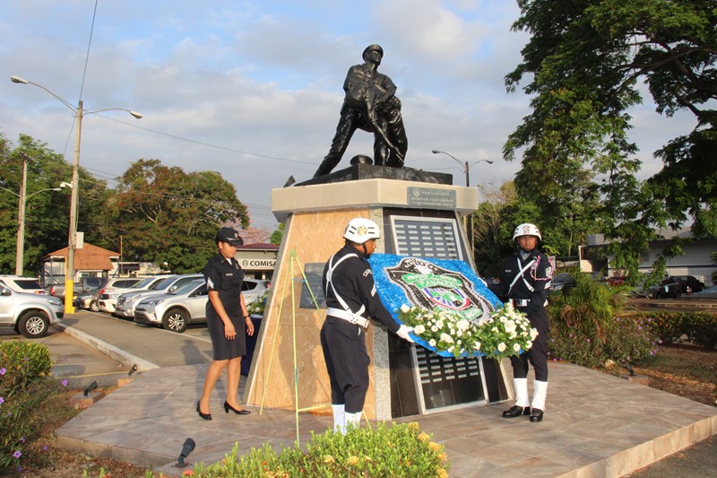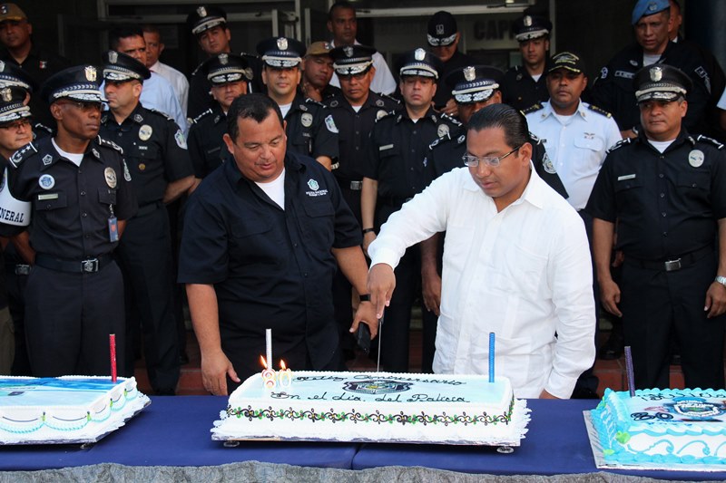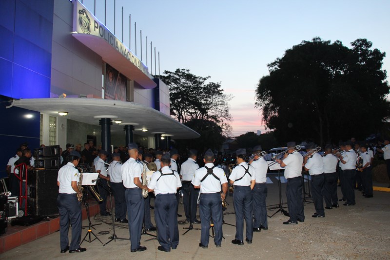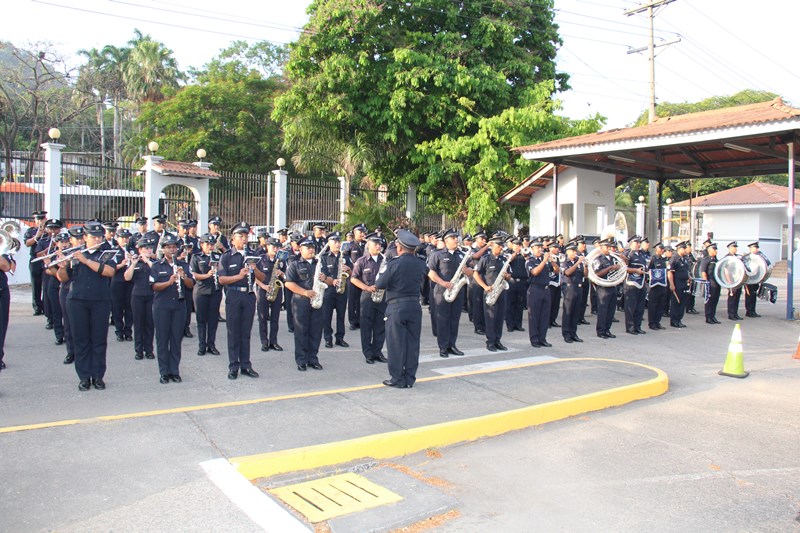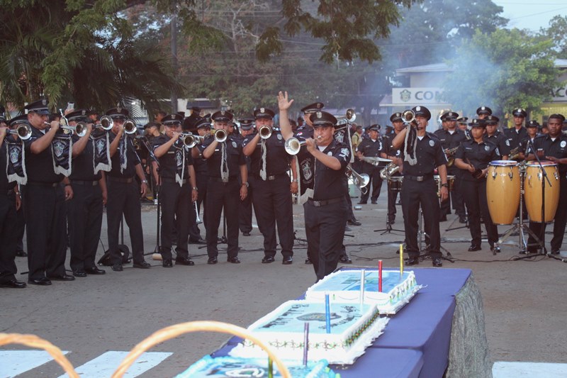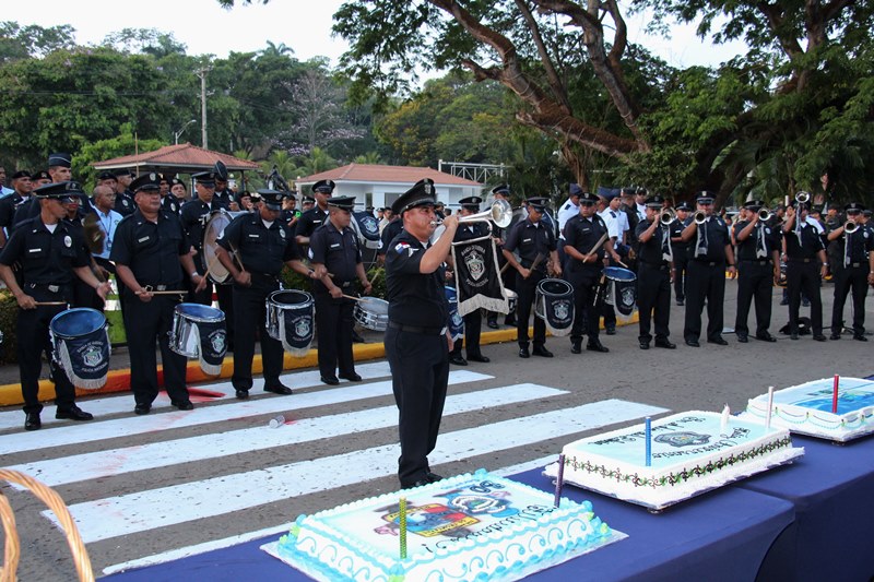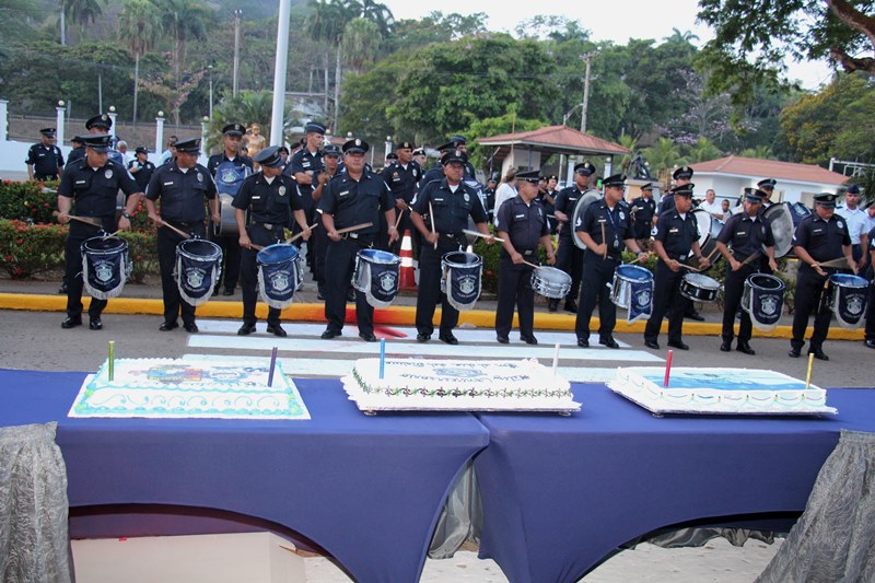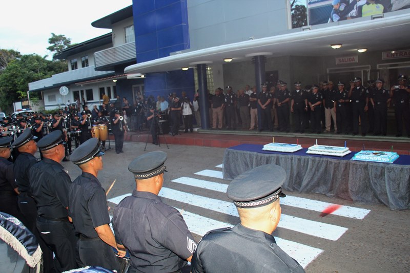 La celebración del 80 aniversario del “Día del Policía”, continuaron este lunes 3 de abril en nuestra sede de Ancón, con las contagiosas dianas interpretadas por las bandas de la Policía Nacional, Servicio Nacional de Fronteras, Servicio Nacional Aeronaval y del Servicio de Protección Institucional. Todos festejaron. Unidades policiales, personal no juramentado e invitados especiales, se deleitaron con cada interpretación. Todo empezó a eso de las 5:00 a.m. Y reafirmando nuestro compromiso de seguir protegiendo y sirviendo al país, realizamos el acto cívico, donde la invocación religiosa estuvo a cargo el capellán de la Institución Edgar Flores. Además se procedió a colocar las ofrendas florales al monumento de los caídos, en honor de aquellos uniformados que perdieron la vida en el cumplimiento del deber. “Cada año… como Día del Policía, se rinde homenaje a la labor abnegada y sacrificada que realizan los hombres y mujeres que orgullosamente integran esta noble Institución que tiene la responsabilidad de garantizar la paz y la seguridad de los habitantes de esta patria panameña”, dijo durante el acto el Director General de la Policía Nacional, Omar Ariel Pinzón Marín. En cuanto a los aspirantes a Policía Ejemplar, el Director General destacó que ellos son digno de imitar porque han dibujado su huella imborrable al honrar a la Patria y a los compromiso que una vez juraron cumplir al pie de la letra, porque han trabajado con integridad, transparencia, vocación y modelo para las futuras generaciones de policías. Seguido el Director acompañado por el Secretario General del Ministerio de Seguridad Pública, Aron Pérez; Director del Servicio Nacional de Fronteras Cristian Hayer; el Director del Servicio Nacional Aeronaval, Belsio González; miembros del Directorio Policial e invitados especiales, se cantó el “feliz cumpleaños”.