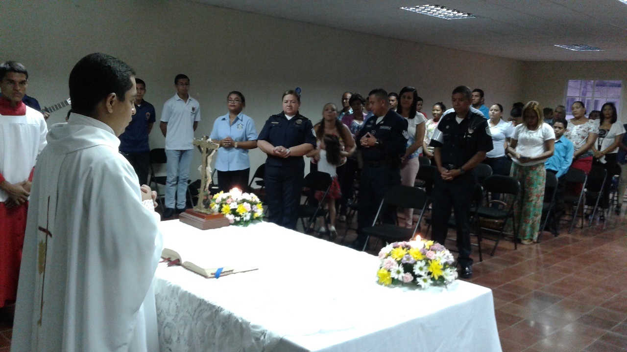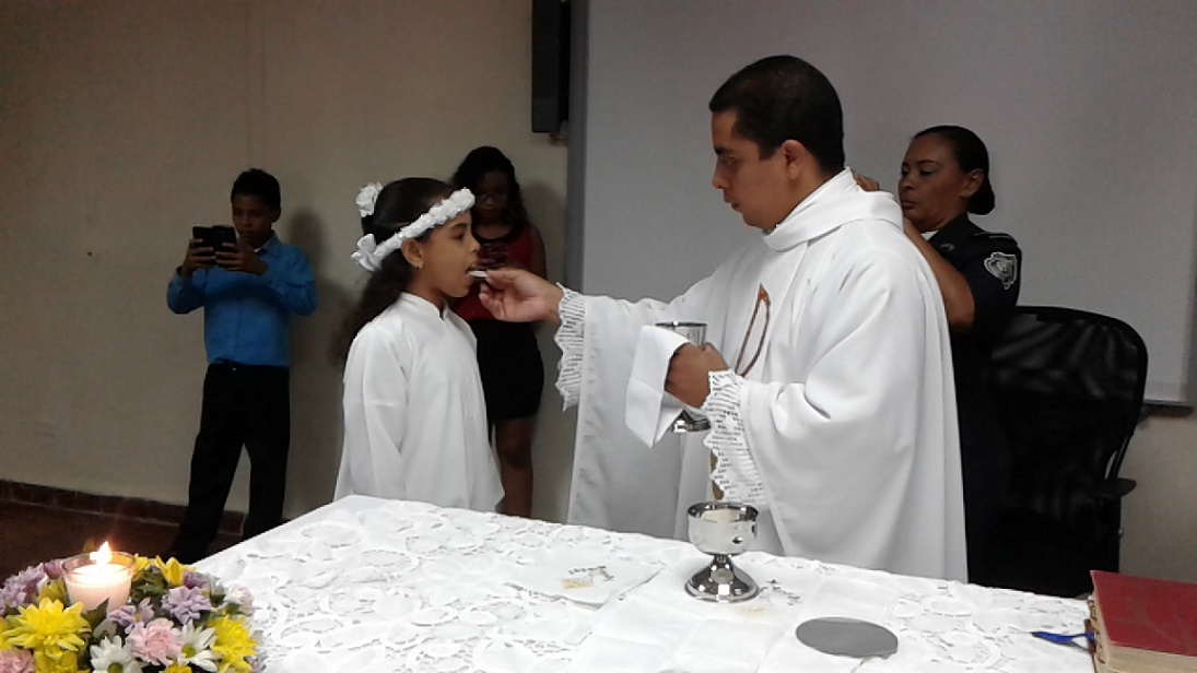 Un total de 10 niños y niñas hijos de unidades de la Policía Nacional recibieron el sacramento de la comunión, en el salón de conferencia de la Zona de Policía de Herrera, donde igualmente se celebró la eucaristía, presidida por el Presbítero Daniel Mora; capellán de la Sexta Zona Policial. Al acto religioso asistieron padres, madres y demás familiares de los niños, al Igual que unidades policiales de Niñez y Adolescencia, Seguridad Ciudadana y la oficial de turno. En la actividad se agasajó a los 10 niños, involucrado en el recibimiento del santo sacramento, con un almuerzo junto al maestro de Catequesis. |