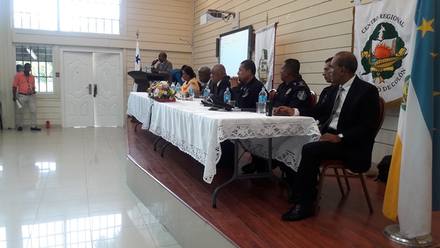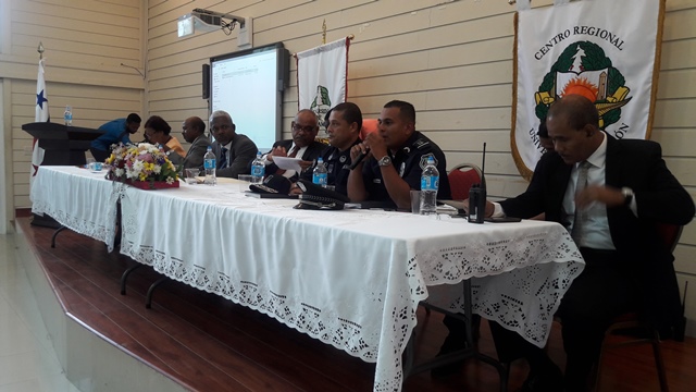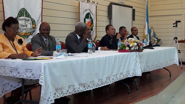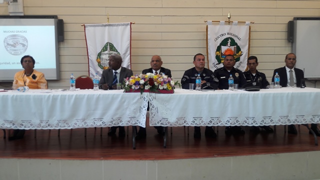 Unidades de la Policía Nacional de servicio en la provincia de Colón participa en el “Primer Congreso Regional Universidad, Sociedad, Desafíos y Oportunidades”, que organiza el centro regional universitario. El comisionado Virgilio Lezcano, acompañado del capitán Víctor Sánchez, de la oficina de Seguridad Ciudadana y el subteniente Mario Cisneros, de Planeamiento, fueron los que expusieron por la Policía Nacional el tema Colón, Realidad y Consecuencias Sociales en materia de seguridad. La Policía Nacional luego de la exposición contestó las preguntas que se les hicieron en materia de seguridad. En el congreso estuvieron presente el Magister Juan Fidel Macías, director del centro regional universitario, profesores y estudiantes. |