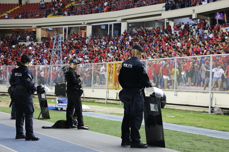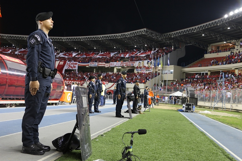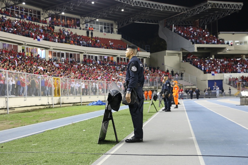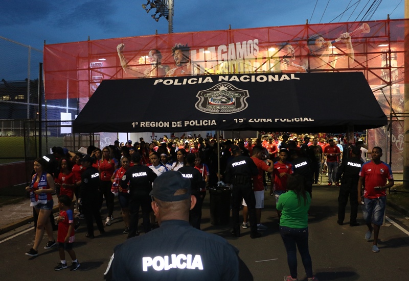 Más de 800 unidades de la Policía Nacional brindaron la seguridad a los panameños y extranjeros que asistieron este martes 13 de junio al Estadio Rommel Fernández para disfrutar del encuentro de fútbol de Panamá vs Honduras. Previo al partido, el Director General de la Policía Nacional, Omar Ariel Pinzón Marín acompañado por miembros del directorio y jefes de los servicios policiales, supervisó el dispositivo de seguridad dentro y fuera de las instalaciones de este campo deportivo. “El éxito de este operativo se debe a la planificación que de ante mano realiza la Policía Nacional para este tipo de eventos”, dijo Pinzón Marín. Se evitó el ingreso de objetos punzo cortantes, de vidrio y otros artículos, como parte de las recomendaciones de seguridad. Participaron unidades de diferentes dependencias policiales como el Servicio Motorizado “Linces”, Grupo de Apoyo al Servicio (G.A.S.), Unidad de Control de Multitudes (UCM), entre otras. También la Policía Nacional a través de la Dirección Nacional de Operaciones de Tránsito implementó un operativo en las vías y semáforos próximos al estadio, lo que permitió el flujo vehicular. Bajo estas medidas de prevención, los fanáticos apoyaron a sus equipos, que empataron 2-2 y con esto Panamá suma 7 puntos en la hexagonal final y su tercer empate consecutivo en casa.