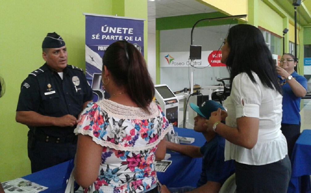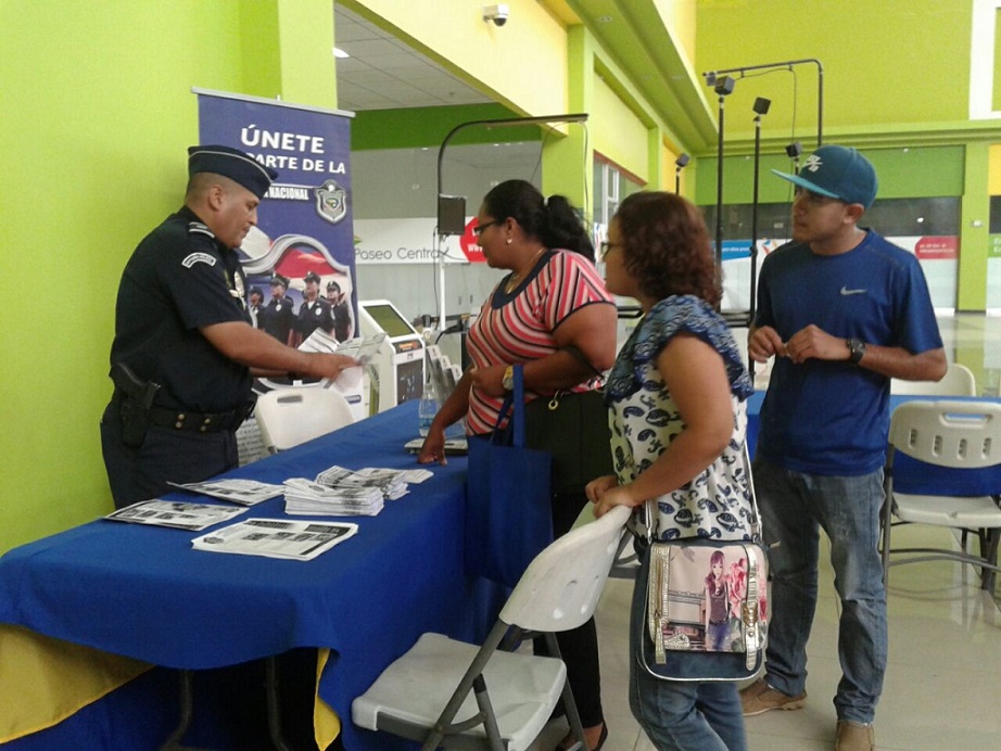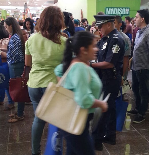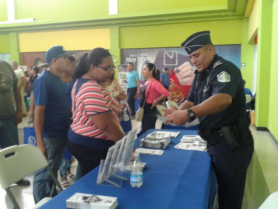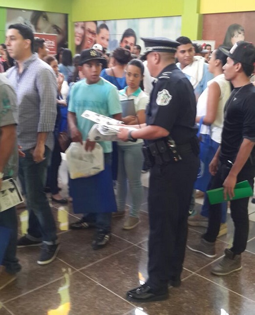 Unidades policiales de la oficina de Seguridad Ciudadana y de Reclutamiento realizaron un volanteo en una feria de empleo que se lleva a cabo en el Paseo Central de Chitré, sobre medidas de seguridad para no ser víctima de antisociales. En la interacción con la ciudadanía se le proporcionó tarjetas con los diferentes números telefónicos y se le exhortó que denuncien el delito. También el Departamento de Reclutamiento se acercó a los jóvenes que para promover la carrera policial; con entregas de panfletos y volantes con requisitos y beneficios que ofrece la institución. |