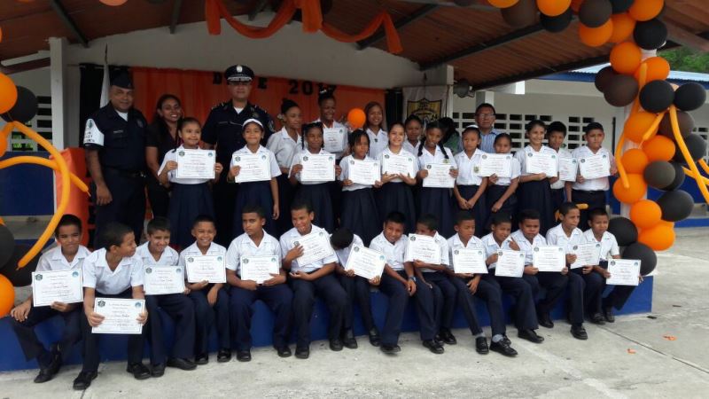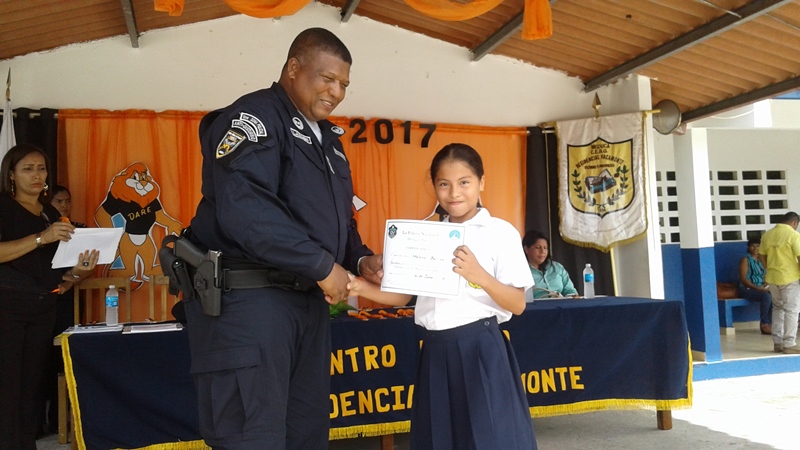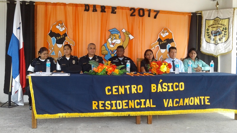 Un total de 200 estudiantes de V y VI grado de Centro Básico Residencial Vacamonte, corregimiento de Vista Alegre, distrito de Arraiján, acompañados de sus padres, recibieron este viernes 30 de junio sus respectivos diplomas de culminación del curso D.A.R.E La ceremonia de clausura fue presidida por el Comisionado Luis Navarro, Jefe de ésta Zona Policial quien instó a los niños a poner en práctica todo lo aprendido durante seis semanas. La estudiante Grece Rivera del V grado en representación de sus compañeros agradeció a la Policía Nacional que una vez más haya tomado a este centro educativo para brindar estos cursos preventivos. La clausura contó con la participación de la licenciada Vanessa Barría, Fiscal de Drogas, el Subcomisionado José Melamed, Jefe del Área y Directores de instituciones quienes hicieron entrega de los diplomas a todos los participantes.