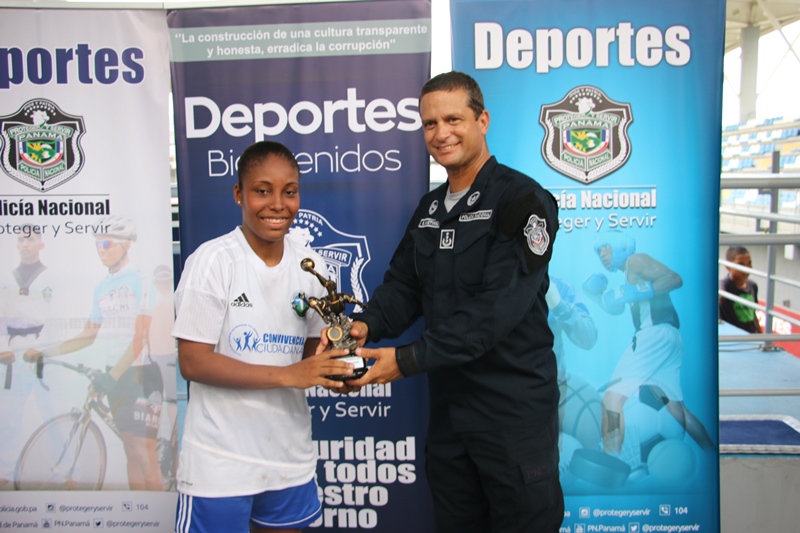 El equipo de la Zona Policial de San Miguelito logró coronarse campeón en la categoría femenina del Treceavo Campeonato Interzona de Fútbol de la Policía Nacional, al anotar 3 goles a 2 ante su par de la Dirección General (DIGEN), que se sitúa como subcampeón. Esta final se disputó el viernes 30 de junio de 2017, en el estadio Maracaná ubicado en el corregimiento de El Chorrillo, donde las integrantes de cada equipo ofrecieron al público un juego de excelente nivel, digno de los profesionales de este deporte. Jugadoras como Kimberly Orocú, Yisbely Rodríguez de la DIGEN, Ericka Contreras, Emely Dow y Jehiny Gallardo, de la 11ava Zona Policial de San Miguelito dieron el “todo por el todo” y demostraron su agilidad y destreza en la cancha. El Director General de la Policía Nacional, Omar Ariel Pinzón Marín destacó que esta actividad que es tradición en la institución, busca fortalecer el espíritu de cuerpo, sentido de pertenencia, el compañerismo, el trabajo en equipo y la unidad en la familia policial. “Para mí y para la Policía Nacional todos sus integrantes son importantes, unidos trabajamos bajo una gran responsabilidad de brindar tranquilidad a la comunidad, y ese esfuerzo se refleja en las cifras. Una de nuestras cualidades es ser transparentes en todas nuestras actuaciones, en ser unidos y apoyar a nuestros compañeros”, dijo Pinzón Marín. En la clausura de este evento deportivo, se dio con la premiación a los primeros lugares en las categorías Veterano, Abierta y Femenina. En el tercer lugar de la categoría femenina quedó el equipo de la Escuela de Oficiales de Policía (Esopol) y en cuarto lugar la Unidad de Control de Multitudes (UCM). Mientras que en la categoría Veterana Masculino, el equipo de la Dirección de Investigación Judicial (DIJ) se alzó como campeón y la Zona Policial de San Miguelito, subcampeón. La Primera Región de Policía obtuvo el tercer lugar y la Dirección Nacional de Ingeniería e infraestructura, el cuarto puesto. En la categoría Abierta Masculina, la Dirección Nacional de Bienestar Policial y Familiar se llevó el título de campeón; en segundo lugar, el Grupo de Apoyo Al Servicio (Gas); la Dirección Nacional de Inteligencia Policial (DNIP) se colocó en tercer lugar y la Dirección Nacional de Recursos Humanos, en cuarto lugar. También se entregaron trofeos al Campeón Goleador, Guardameta Menos Vencido y Jugador Más Valioso en las tres categorías. Al final se invitó a los presentes a continuar la tradición deportiva en la institución, que a su vez promueve el bienestar físico y emocional.